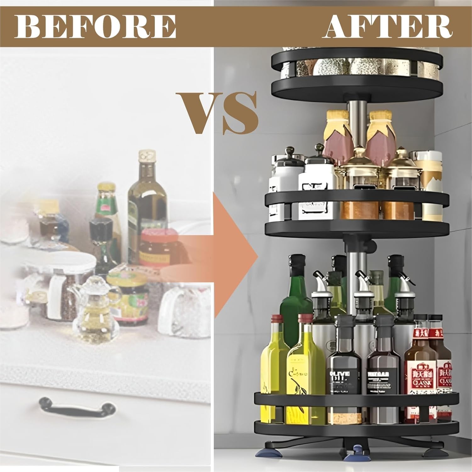 𝟑𝟔𝟎° 𝐅𝐫𝐞𝐞 𝐑𝐨𝐭𝐚𝐭𝐢𝐨𝐧 𝐟𝐨𝐫 𝐄𝐚𝐬𝐲 𝐀𝐜𝐜𝐞𝐬𝐬: This rotating spice rack offers 360° free rotation, allowing you to access spices, condiments, or seasoning bottles effortlessly. Whether you place it inside a cabinet or on the countertop, this rotating tray provides flexible adjustment, ensuring you grab what you need instantly.