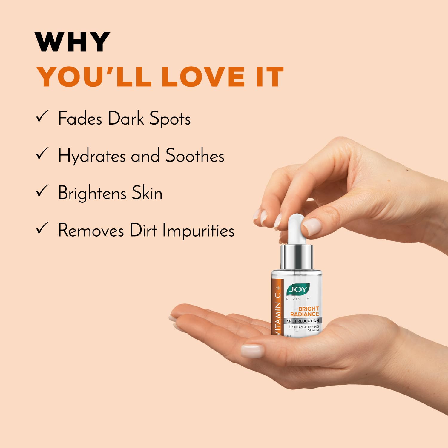 Does your skin look gloomy? Down with dullness & marks? Relax now, as we bring you an excellent natural serum for a bright & glowing skin. Say yes to healthy and bright skin with the new Joy Revivify Vitamin C+ Skin Brightening Serum. It creates a protective layer on the skin’s surface that instantly peps up nourishment levels. Nothing is better than trying this serum that boosts brightness, fades dark spots, softens fine lines and wrinkles. Now step up with confidence and flaunt your newly reclaimed radiance!
