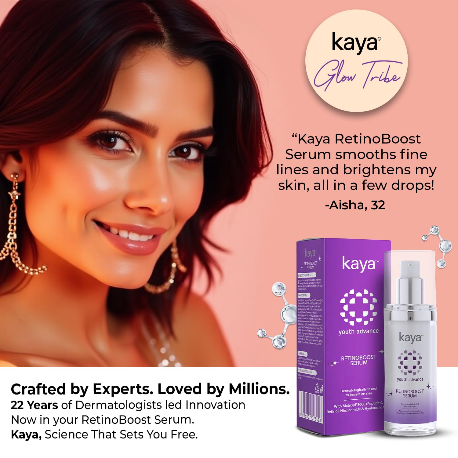 Designed for fine lines, wrinkles, and early signs of aging, Kaya RetinoBoost Serum blends dermatologist-recommended Retinol with Matrixyl 3000 and Niacinamide to visibly smooth skin, firm texture, and restore youthful bounce. Developed using 22 years of clinical dermatological insight.