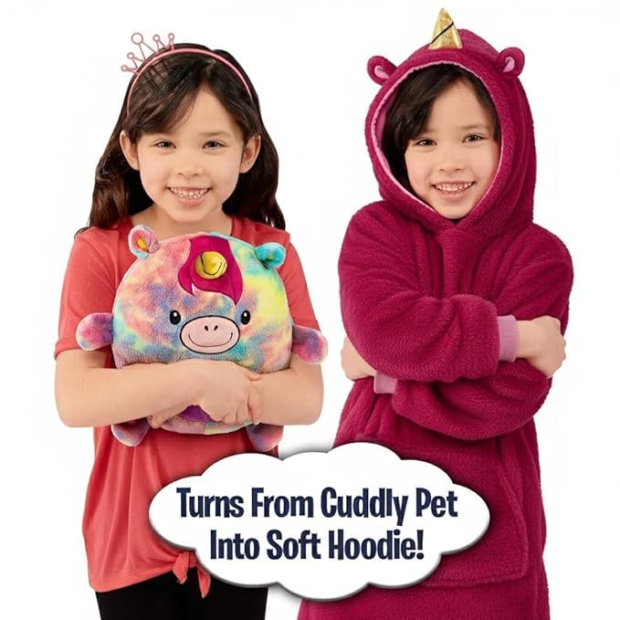 Your kids will stay warm and cozy the Children’s Maxi Wearable Blanket with Hood Blanket with Sleeves Children’s Maxi is the fun, new pet that’s also a super warm and soft hoodie! It stores as a pet but opens up to an ultra-soft and super warm oversized hoodie! The pet folds magically into the hood and zips securely inside! Perfect for when your kids are playing outside or lounging around the house. Children’s Maxi is one size fits all, so it’s great for kids of any age!