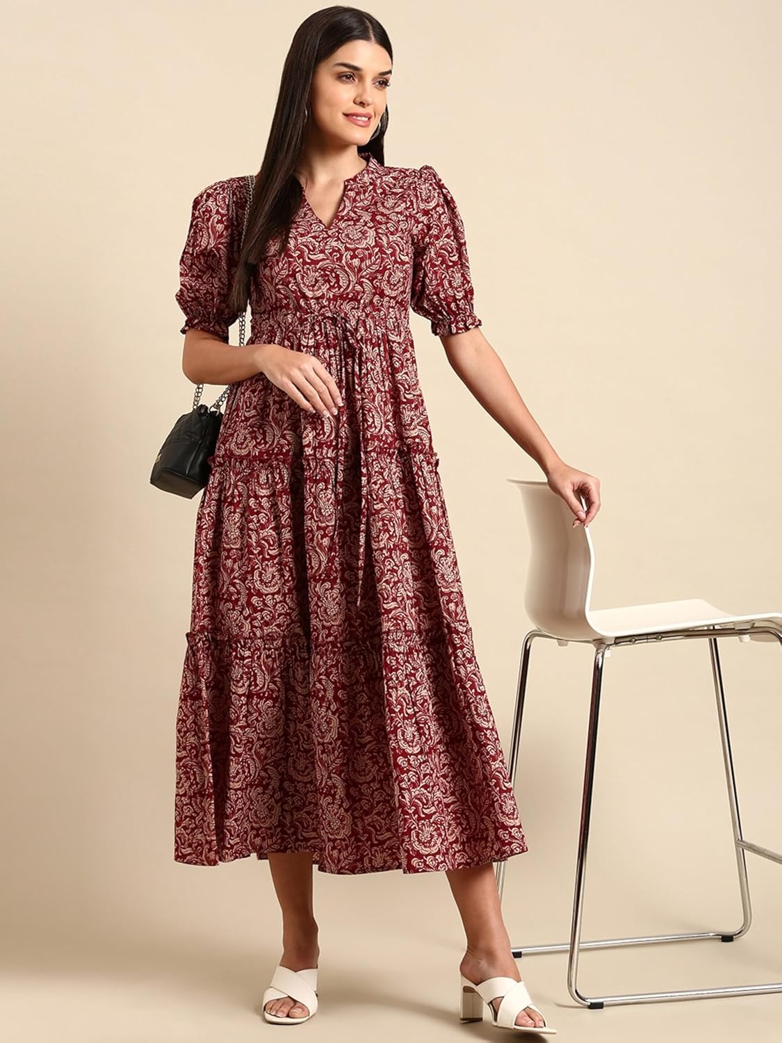 Step into effortless elegance with this beautifully designed women’s midi dress. Featuring a fit & flare cut, ruffled puff sleeves, and a vintage-inspired floral print, this dress strikes the perfect balance between classic and contemporary. Made from breathable and lightweight polyester, it ensures comfort without compromising on style. Whether you’re headed to a casual day out or a relaxed evening event, this dress will keep you looking polished and feeling great. Pair with heels or flats and statement earrings to complete your look.