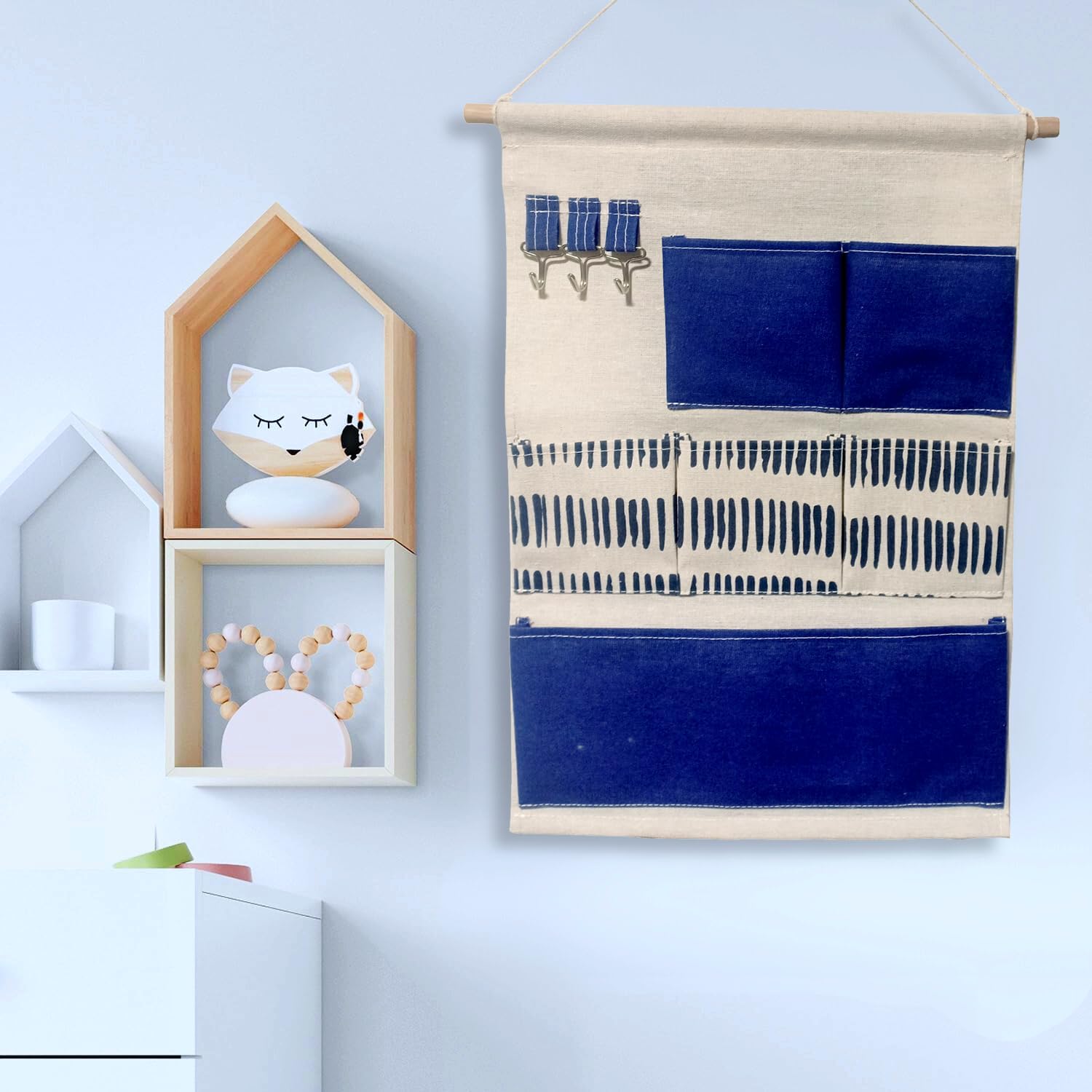 Features: ♦ 1. High-quality materials: It is made of light cotton and linen fabric and wood, which is strong and maintains its shape well when hung on the wall. 2. Exquisite appearance: Total size: 35 x 50cm. It contains different cute elements, you can use them to decorate different places according to your preferences. It is not only a wall-mounted storage box, but also a home decoration. 3. Multifunctional storage: Our wall-mounted storage bags can be hung in bedrooms, bathrooms, kitchens, offices, wardrobes, clothes rail, etc. They are very suitable for storing jewelry, cosmetics, socks, dolls, towels, toys, stationery, snacks, and baby bottles. ,baby product. 4. Foldable design and space saving: with 6 pockets. Foldable design, equipped with wooden strips and cotton rope, can be easily hung on doors, walls, closets, etc. 5. Widely used: fashionable and lovely styles and colors. Not only can it be used as a storage bag, but also as an ornament to decorate the room, office, and living room, adding a sense of fashion to your home, stylish and practical mobile furniture.