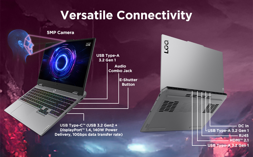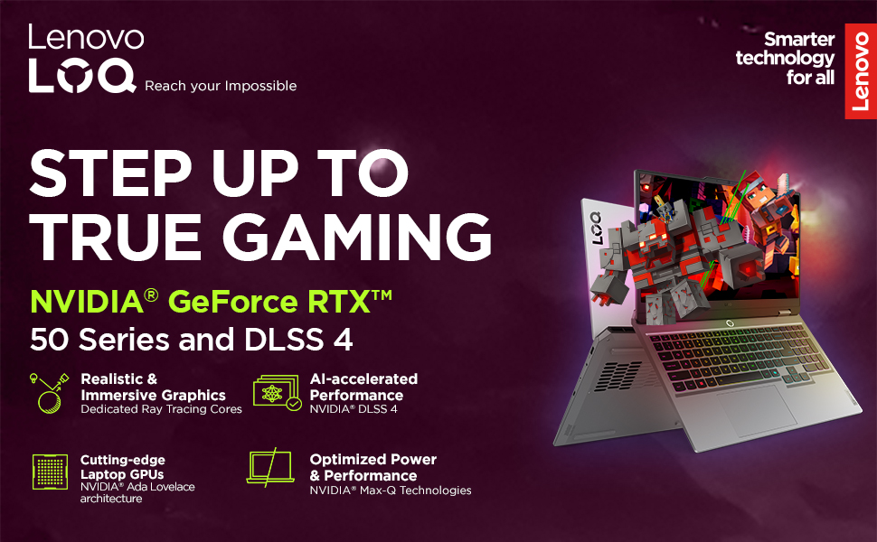 Graphics: NVIDIA GeForce RTX 5050 8GB GDDR7, Boost Clock 2370MHz, TGP 100W | G-Sync || Cooling: Lenovo LOQ’s Hyperchamber Cooling keeps your system cool with turbo fans and copper heatpipes. Fn+Q lets you switch modes for gaming or studying. AI Engine+ ensures sustained cooling during heavy use. Step up to true gaming.