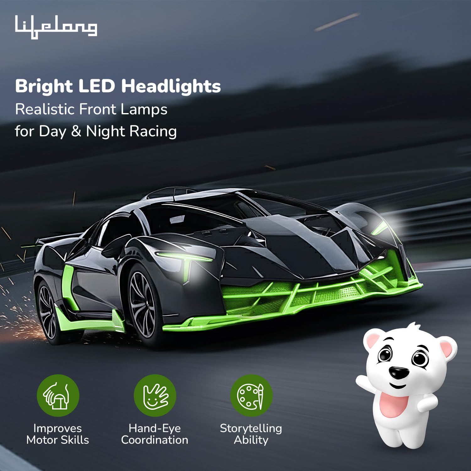 Drive in every direction and perform cool drifts with ease. Headlights activate automatically, adding thrill to night drives.