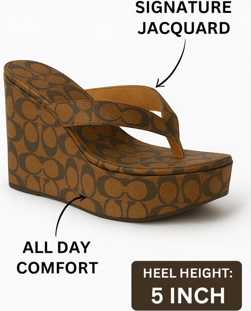 Luxury Women’s Signature Platform Wedge Flip Flop | Brown Monogram Patterned High Heel Slippers for Casual, Party & Resort GGW-5169