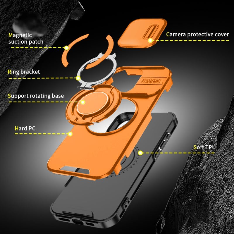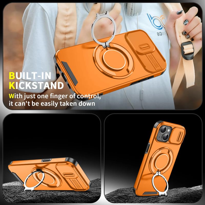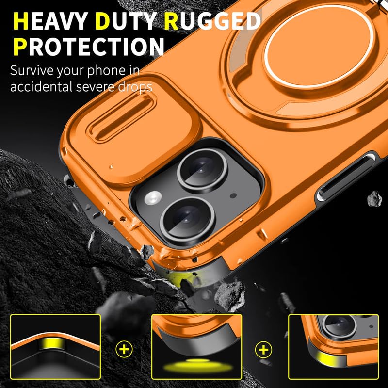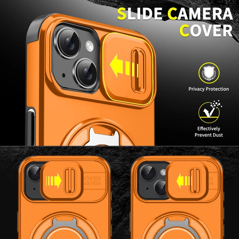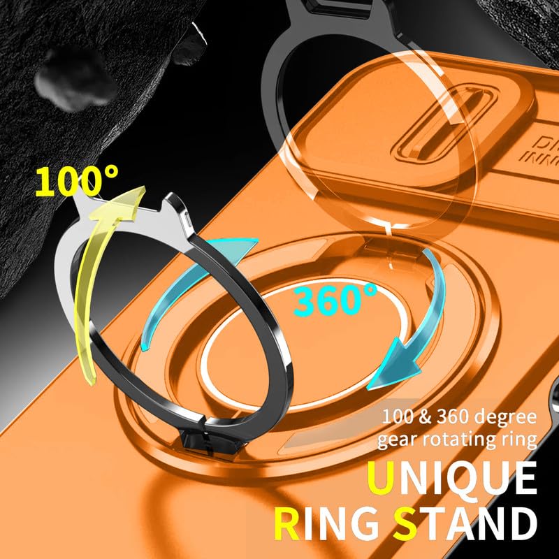 LuxuryKase Shockproof Rugged Case for iPhone 15 | Slide Camera Cover | 360° Rotating Ring Kickstand | Military-Grade Protection – Sunset Orange