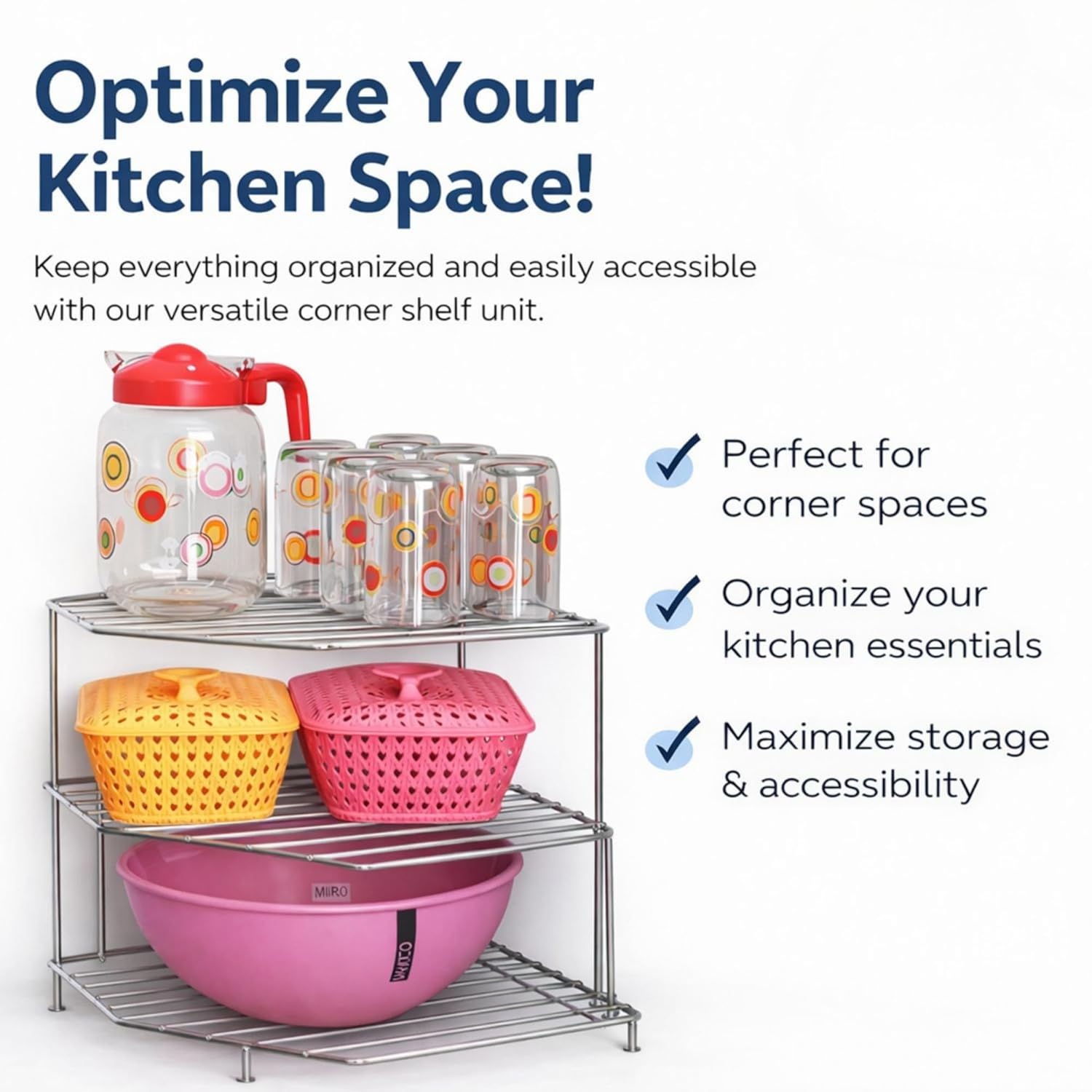 VERSATILE USE: Suitable for organising a wide variety of kitchen items, from pitchers and glasses to storage containers and mixing bowls.