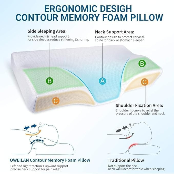 Therapeutic Pillow for Cervical Spondylosis & Posture Correction: Specifically designed for cervical spondylosis, this cervical pillow features a contoured shape that corrects posture, reduces stiffness, and provides relief from chronic neck and shoulder pain.