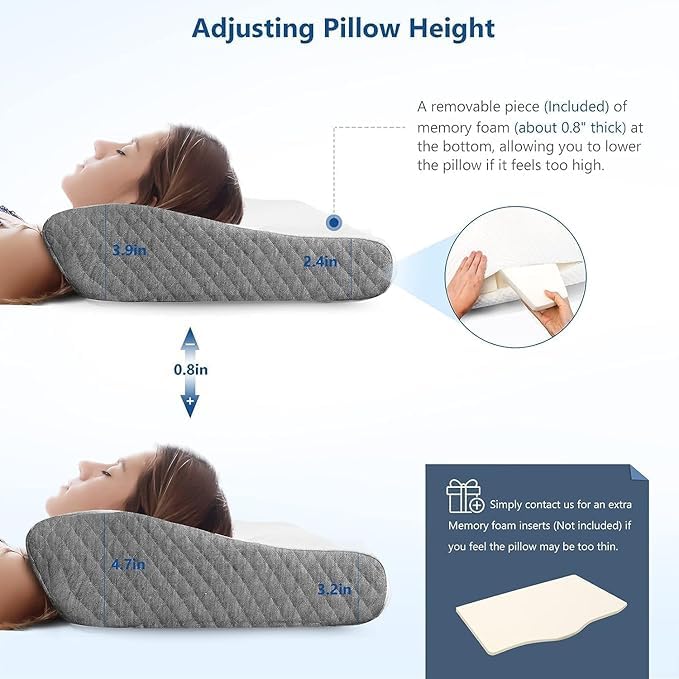 Adaptive Contour Memory Foam:Enjoy the memory foam pillows comfort and support contains 100% memory foam is CertiPUR-US certified,ergonomic pillow occipital surface designed for supports a variety of sleeping positions,perfect balance of firmness and softness.
