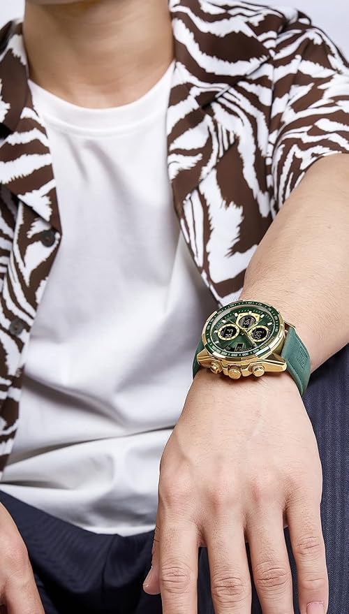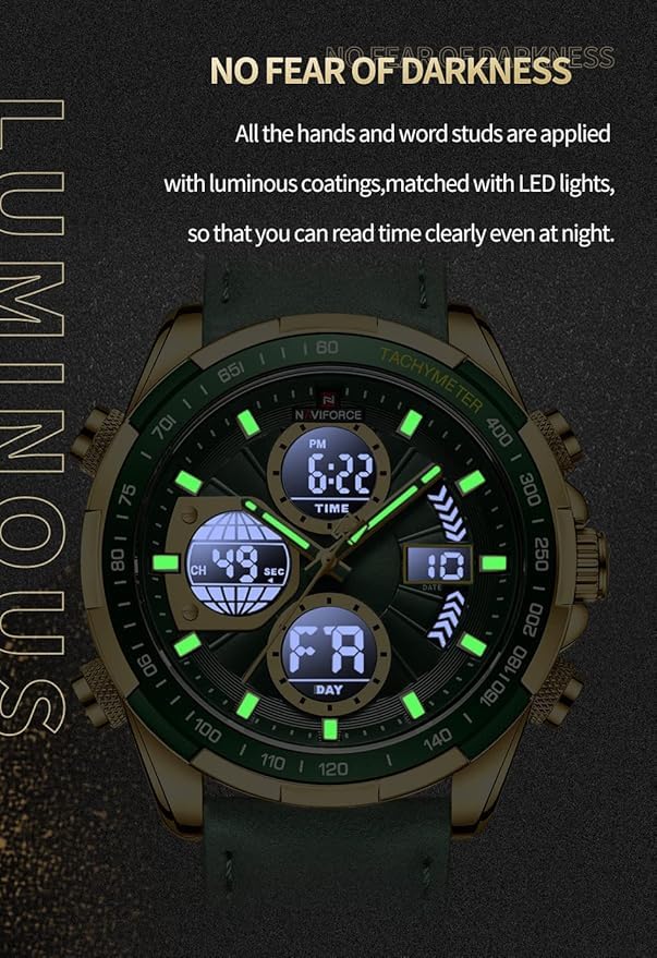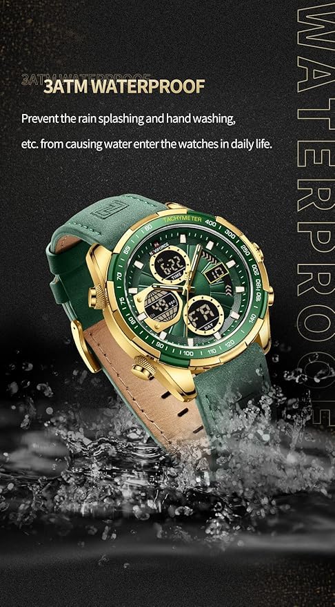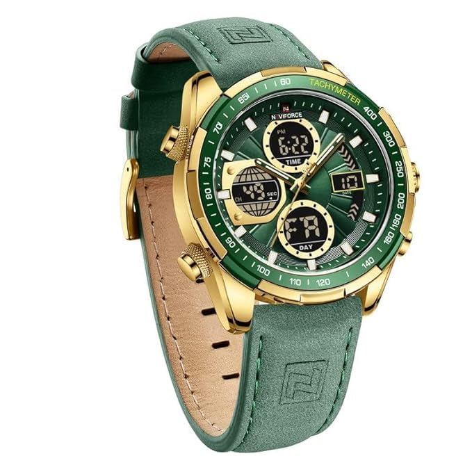 Men’s Latest Military Digital Analog Quartz Watch|Waterproof| Multifunctional | Green Dial | Leather Strap.