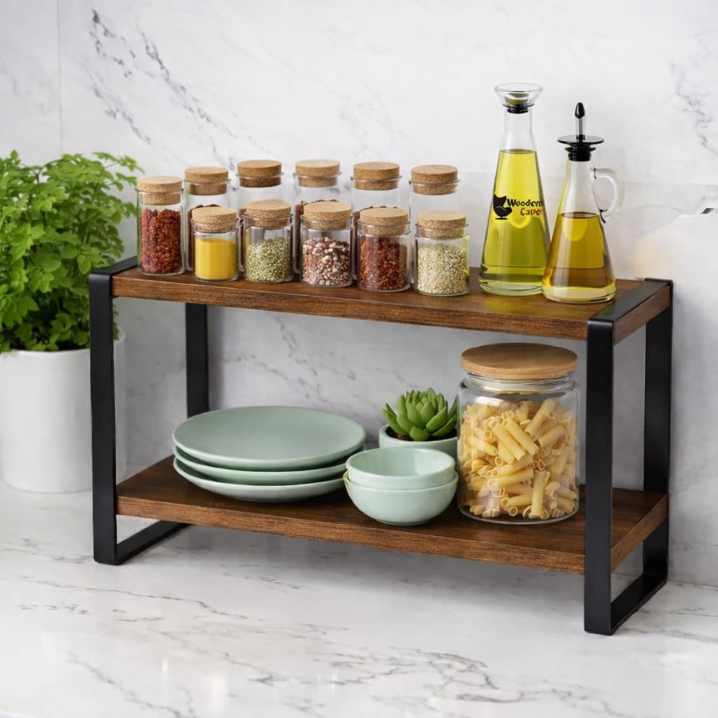 2-Tier Wooden Kitchen Rack for Storage: Strong engineered wood shelves with a durable metal frame—perfect for jars, masala containers, oil bottles, and daily essentials.