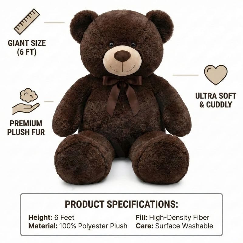 MOSU 6 Ft Giant Teddy Bear – Soft Plush, Big Huggable Stuffed Animal for Kids, Romantic Surprises and Special Occasions(Coffee)