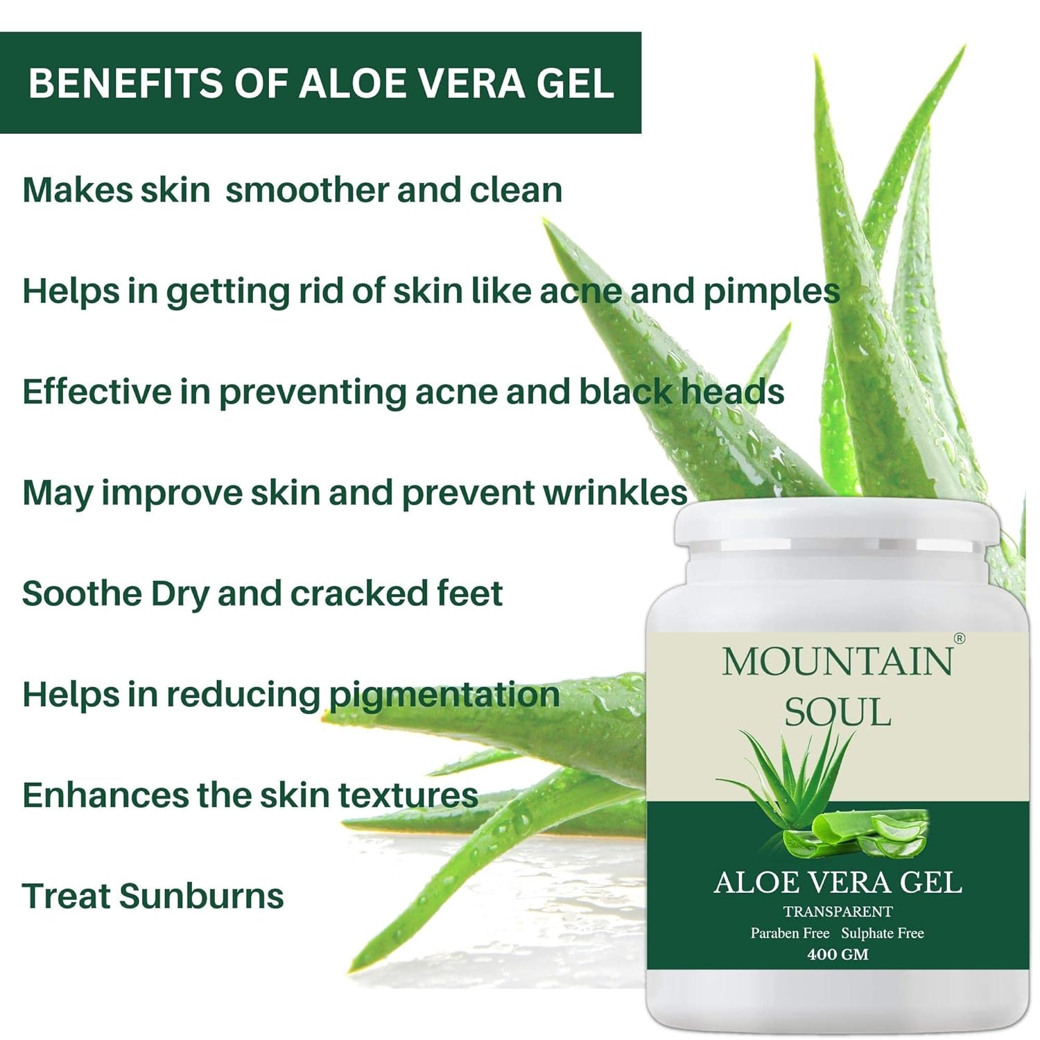 Mountain Soul Aloe Vera Qualities: Pure Aloe Vera gel delivers the benefits of aloe vera in its natural state to moisturize, nourish, repair, soothe, and improve overall skin elasticity while infusing it with natural nutrients. It also, removes pimples, blackheads, dry skin, and oiliness and keeps the face soft and beautiful. Also protects the skin from sunlight.