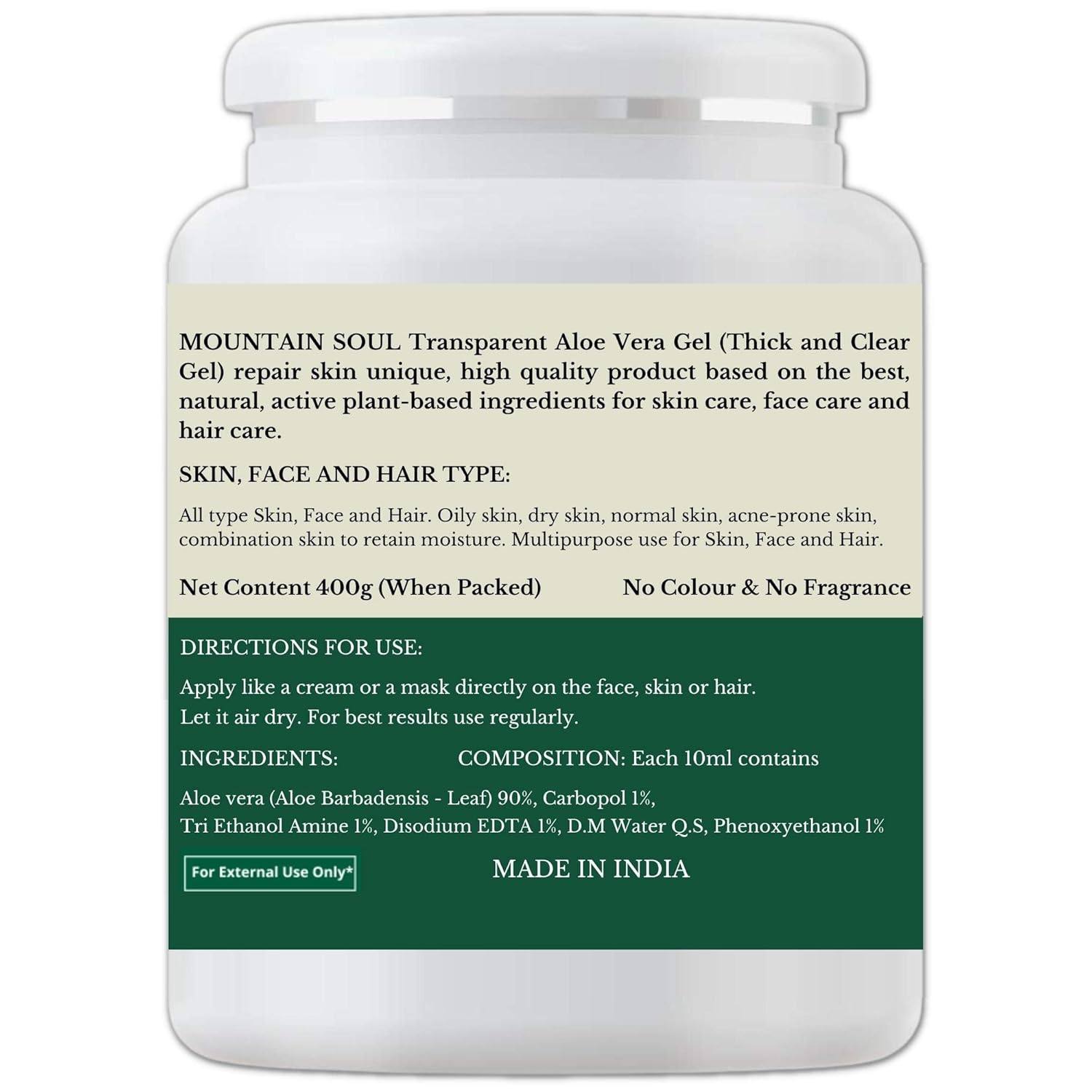 The best, most natural, and active plant-based ingredients are used in Mountain Soul Transparent Aloe Vera gel (Thick and Clear gel), which is a high-quality, one-of-a-kind product for skin, face, and hair care. Type of hair, face, and skin: every kind of hair, face, and skin. to retain moisture on oily, dry, normal, acne-prone, and combination skin. Use for hair, skin, and the face at the same time. Organic Pure Aloevera gel comes in 250g, 400g, and 1kg Big Combo packs. Product solely produced in India. Only for External Use. Mountain Soul Clear transparent aloe vera gel does not contain sulfate, paraben, or color, and it does not have a scent (fragrance).