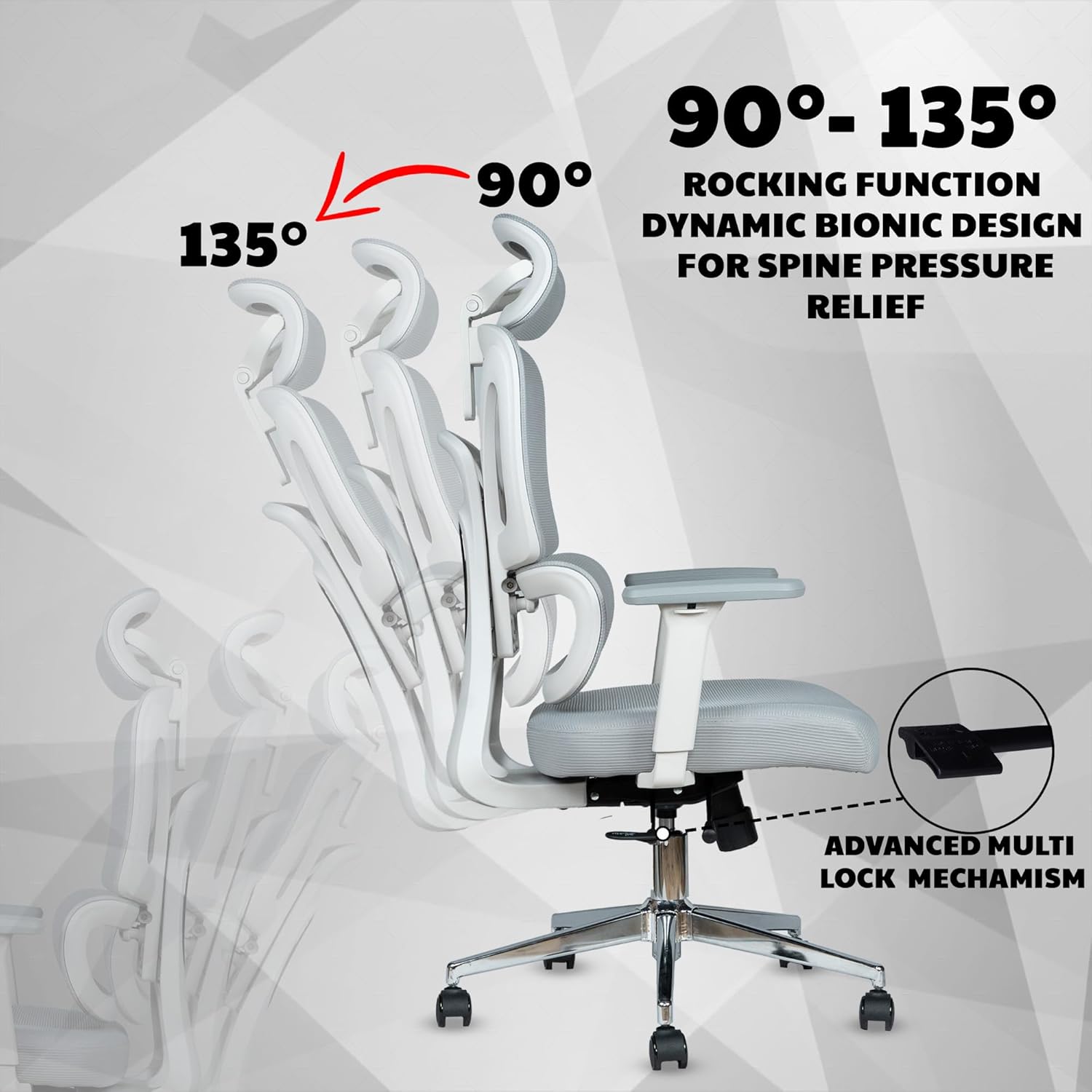 EASY RECLINE WITH MULTI LOCK FEATURE:- Panther Chair comes with a Lever Milti lock mechanism. A pull of your finger on the Lever is sufficient to adjust the seat height and reclining angle up to 135°.