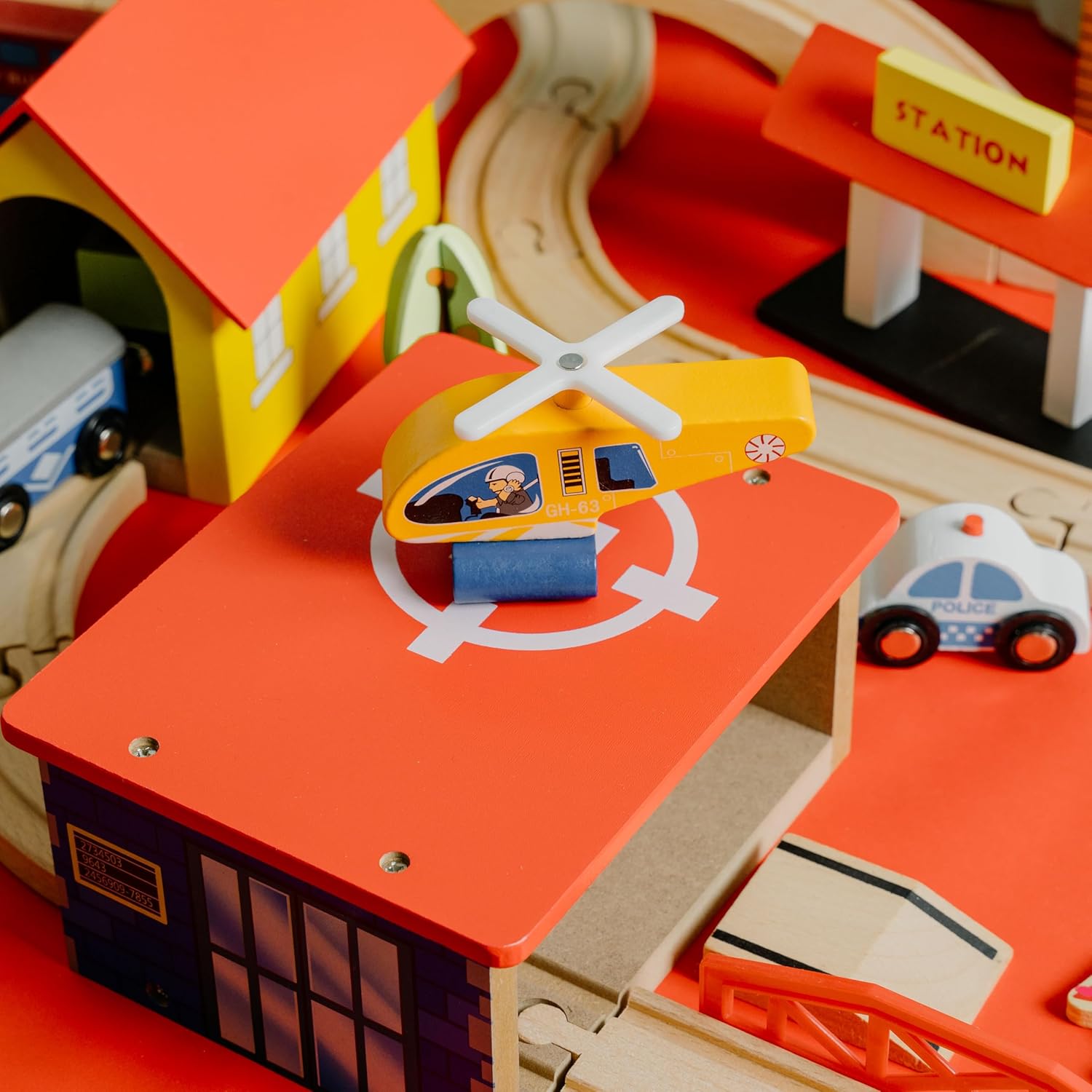 69 PIECES, ZERO INSTRUCTIONS – THE OPEN-ENDED TRAIN WORLD A CHILD BUILDS FROM SCRATCH – 31 wooden tracks (flat and curved), 3 magnetic trains, 1 helicopter, 3 vehicles (police car, ambulance, happy bus), 1 airport, 1 bus station, 3 fish + 1 magnetic fishing rod, trees, people, and scenery. No instruction sheet by design. A straight line today. A city with an airport and a fishing pond tomorrow