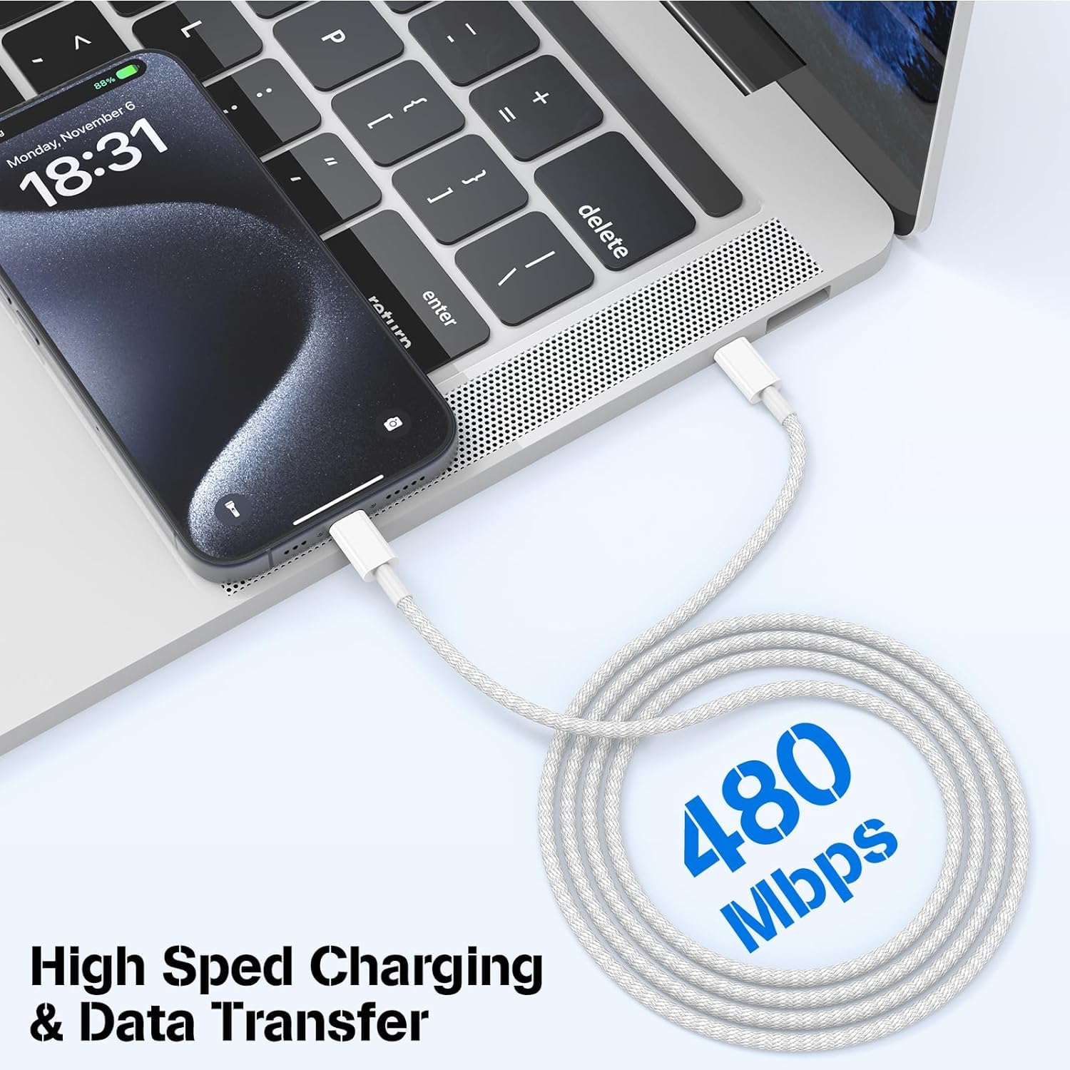 ☀『60W FAST CHARGING』: This usb c to usb c cable supports PD3.0/QC3.0/QC4.0 fast charging up to 60W (20V/3A). Charges USB-C phones from 0% to 80% in 35 minutes, For iPad Pro to 64% in 35 minutes,For Macbook air to 50% in 35 minutes(Use with the original charging head), with data transfer speeds up to 480Mbps (1200+ songs per minute sync).