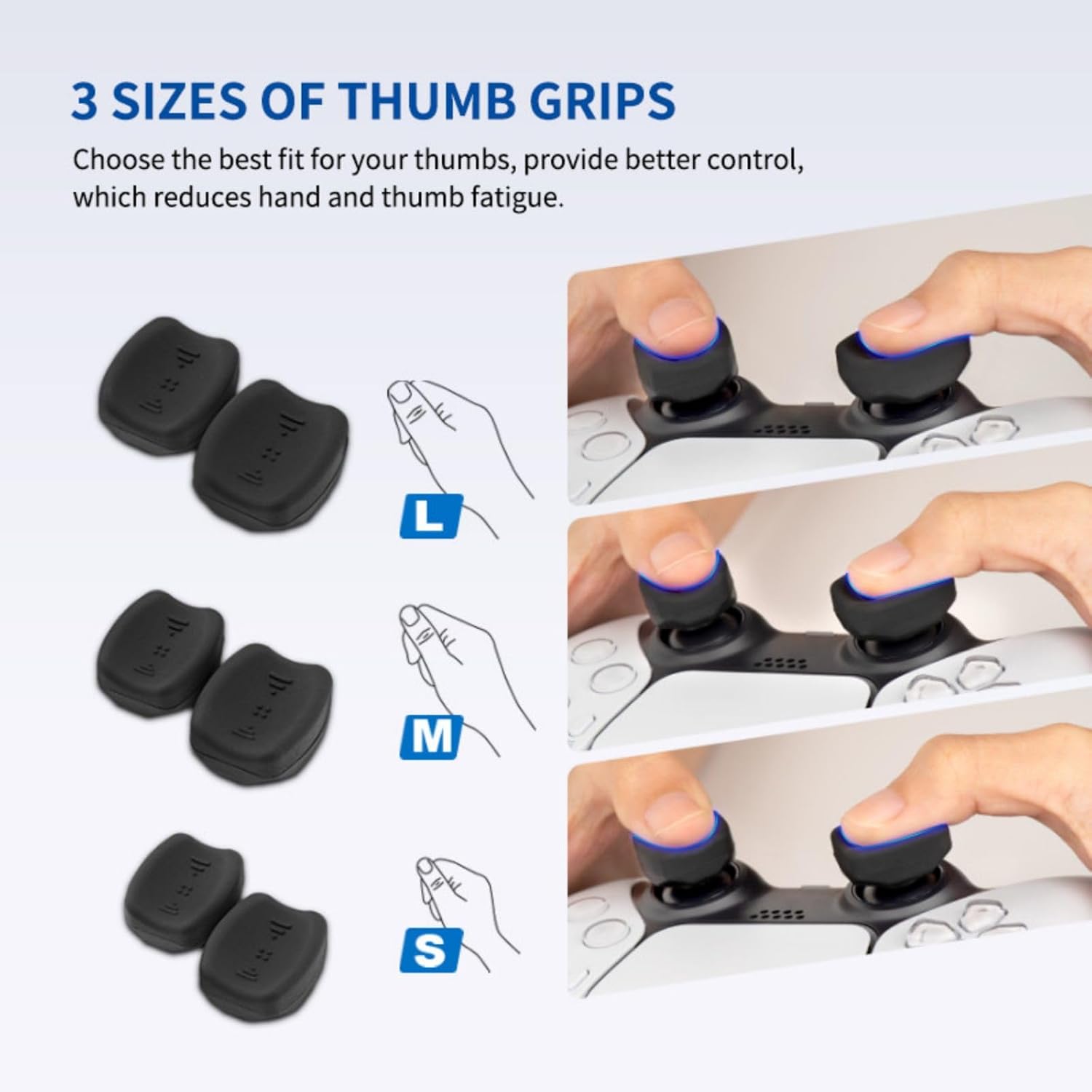 Set of two oval concave thumb grips (left & right) to improve game control and available in three different sizes (L, m and S)