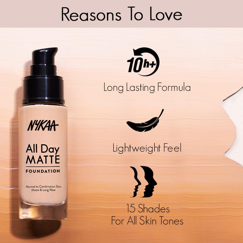 Discover flawless coverage that lasts with Nykaa All Day Matte Foundation. This lightweight liquid foundation delivers a natural matte finish perfect for normal to combination skin types. Formulated with Kaolin Clay for its mattifying properties, this foundation provides comfortable, long-lasting wear for up to 12 hours without the need for touch-ups. The velvety texture feels like second skin while effectively evening out your complexion. Available in shade Ivory 01, this 30ml foundation features a convenient liquid formula that blends seamlessly. The foundation is vegan, dermatologically tested, paraben-free, and cruelty-free, making it a conscious choice for your makeup routine. Whether you’re heading to work or going out to play, this foundation maintains its pristine finish throughout your day, offering reliable coverage that stays put.