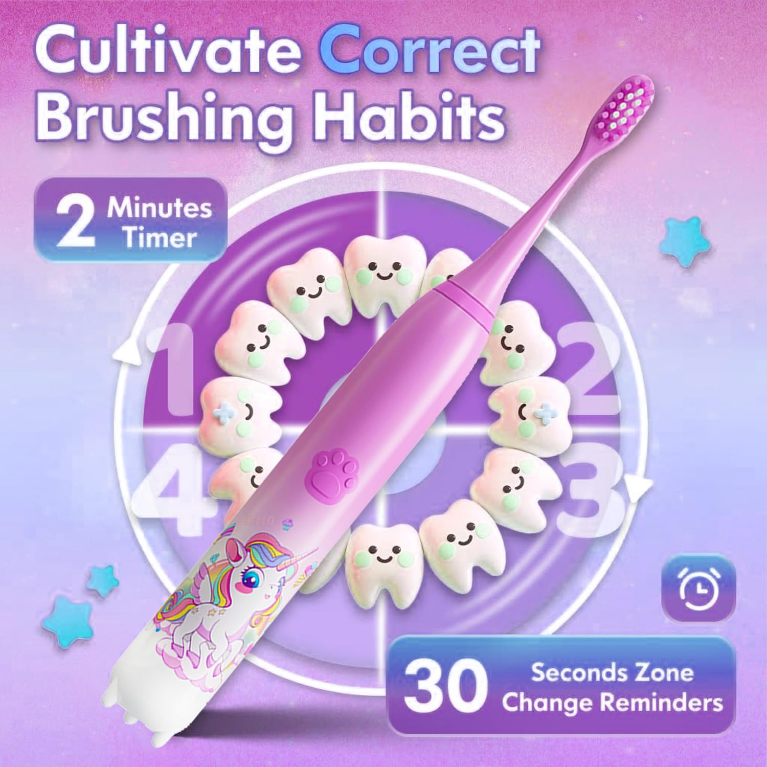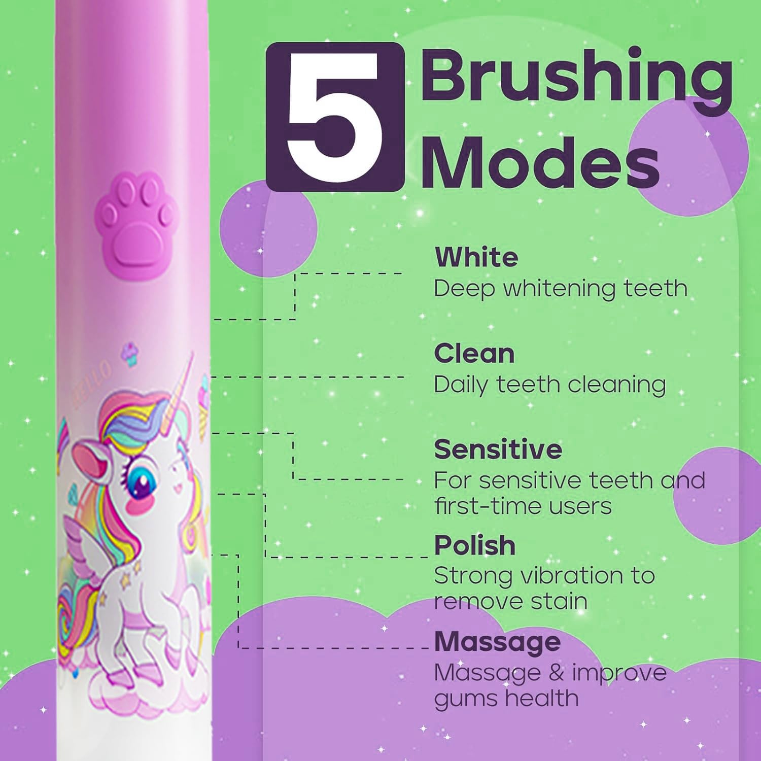 Obvie Sonic Electric Kids Toothbrush with 5 Brushing Modes, IPX7 Waterproof, Soft Nylon Bristles, Rechargeable Battery last up to 30 Days, Type-C Electric Power Tooth Brush, 3 Heads (Purple)