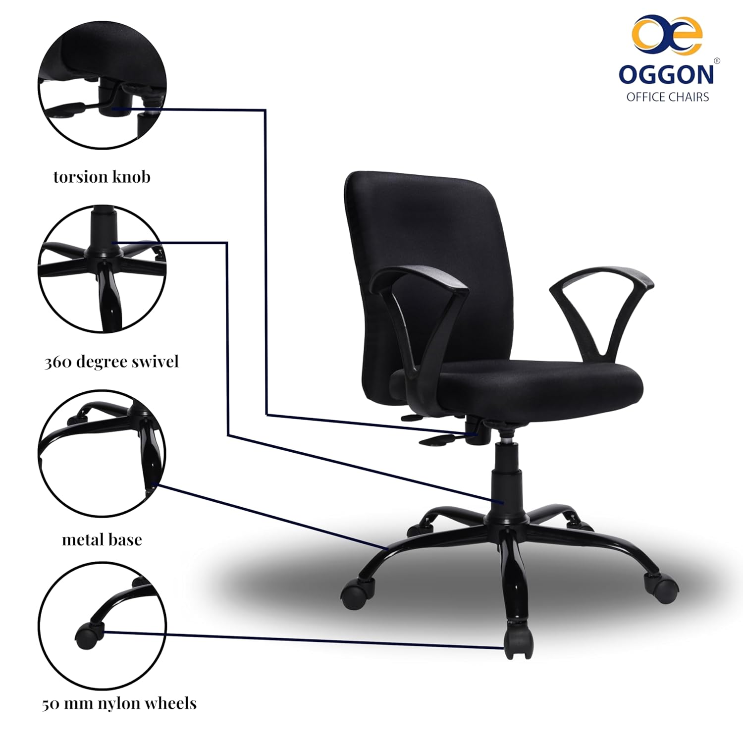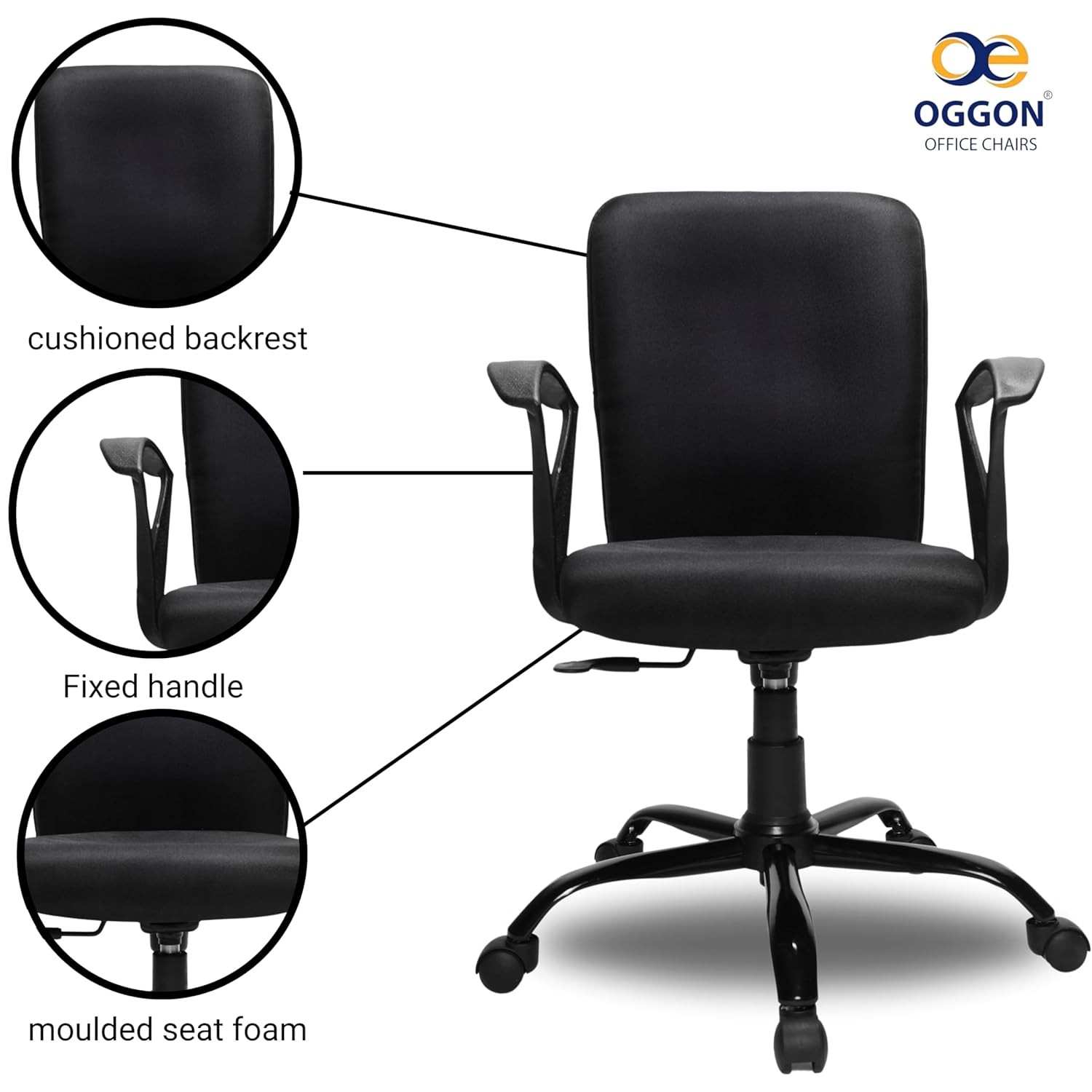 OGGON® FAB Ergonomic Home Office Desk Chair | Swivel | Medium Back | Adjustable Height | Padded with Soft Foam | Metal Base | Home & Office Use | 12 Month Warranty (Black)