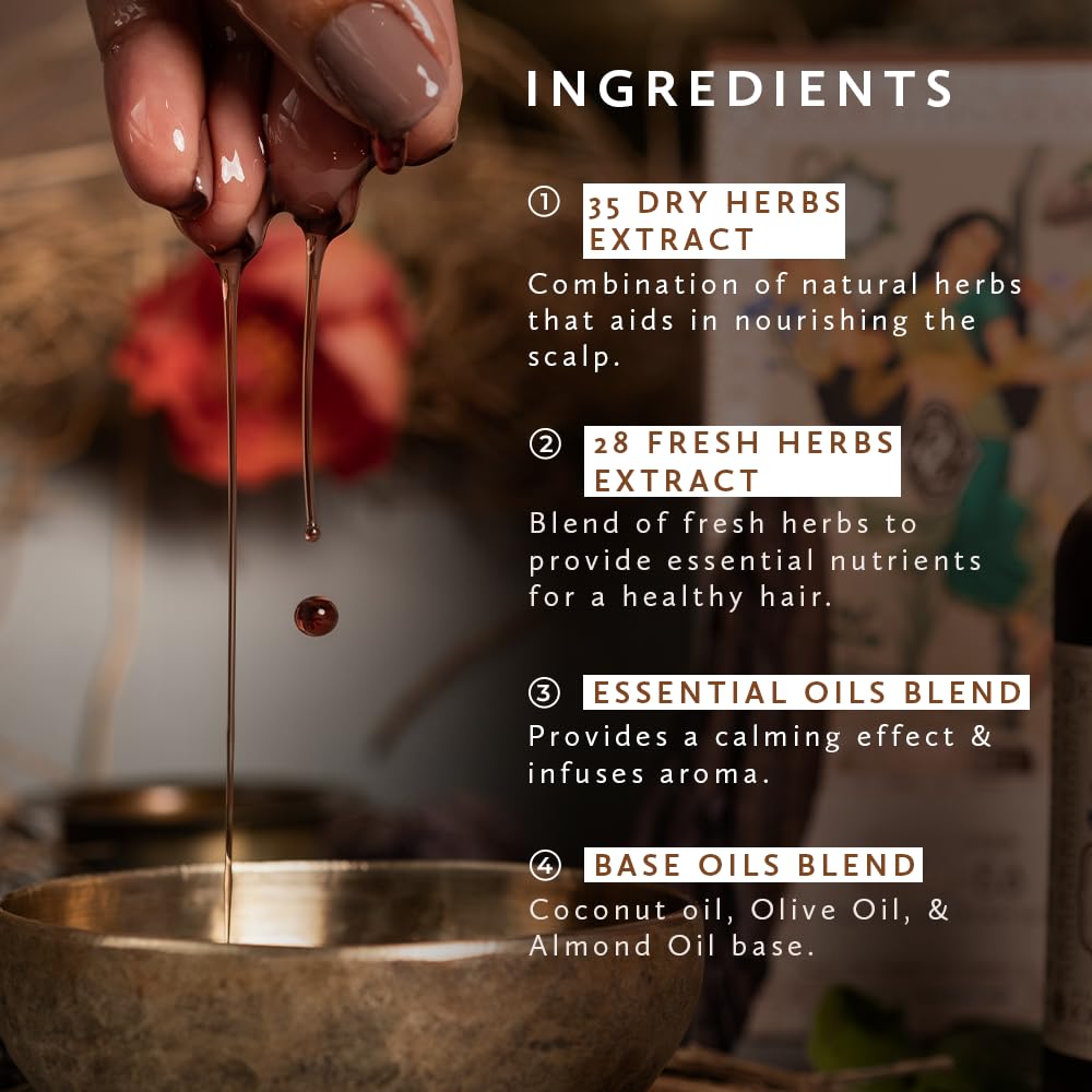 POWER OF 63 HERBS IN ONE OIL: A potent elixir handcrafted with 63 natural herbs including Bhringraj, Brahmi, Hibiscus, Amla, Ashwagandha, and Neelambari to rejuvenate your scalp and strengthen hair from the root.