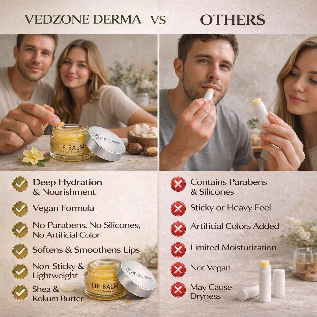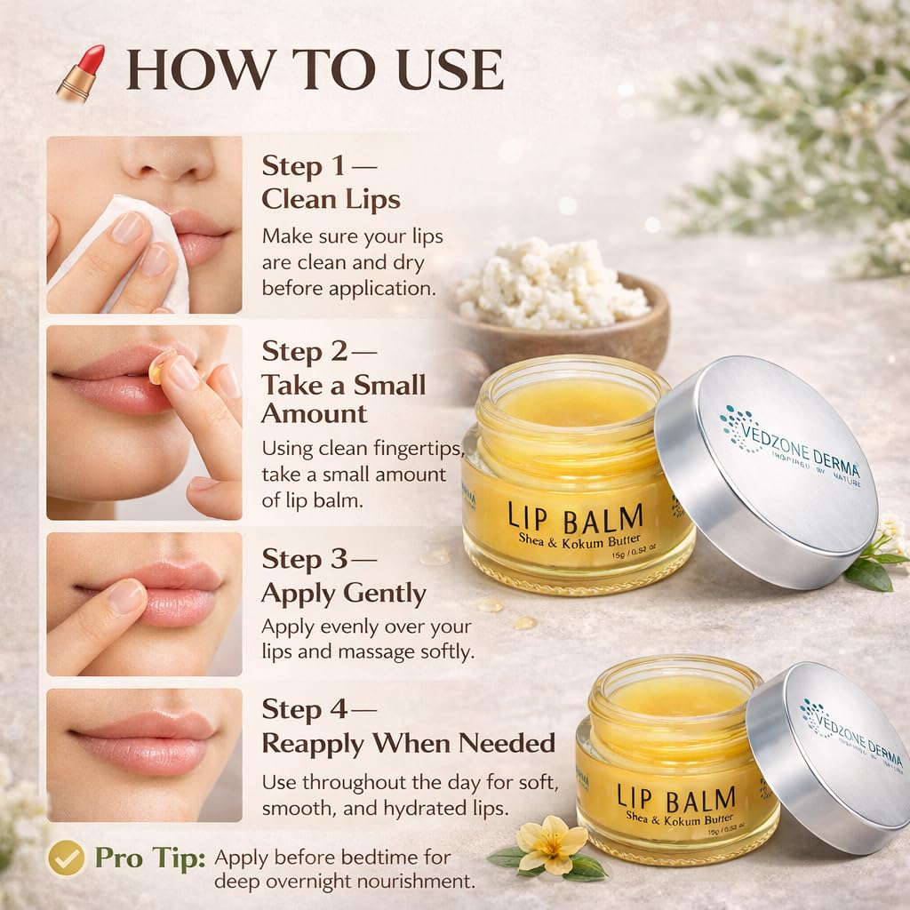 Repairs Dry & Chapped Lips – Helps heal cracked, flaky lips and restores softness with regular use. Long-Lasting Hydration – Provides intense moisture that keeps lips smooth and supple for hours. 100% Gentle Daily Care – Lightweight, non-sticky formula suitable for men & women and safe for everyday use. Protects from Harsh Weather – Shields lips from dryness caused by cold winds, sun exposure & pollution. Free from Harsh Chemicals – Made with natural & Ayurvedic ingredients, suitable for all skin types.