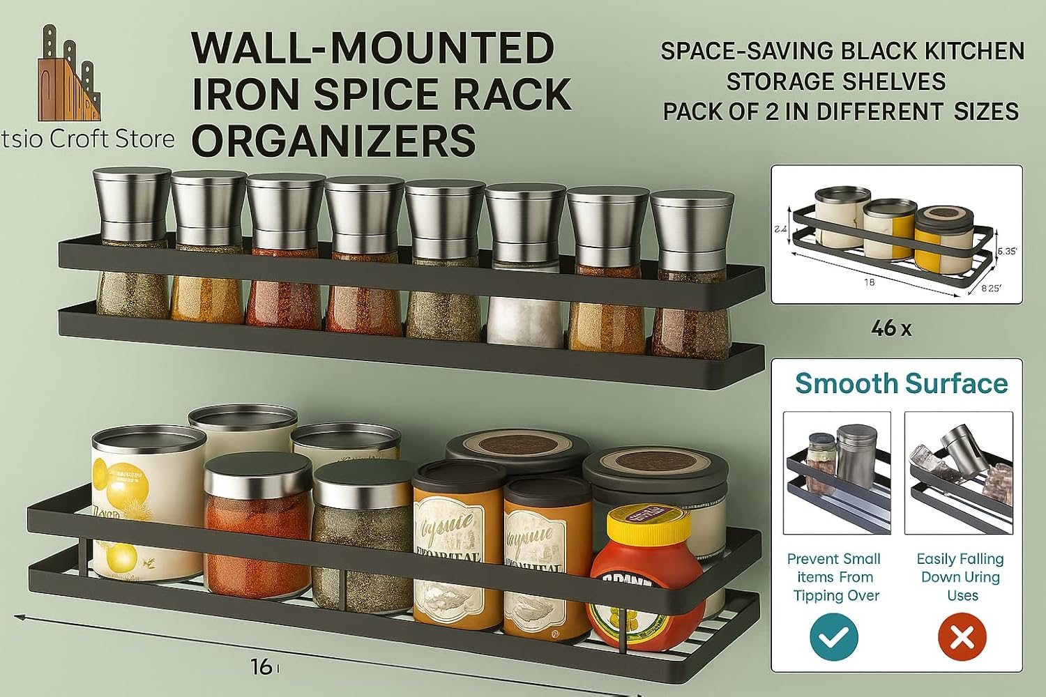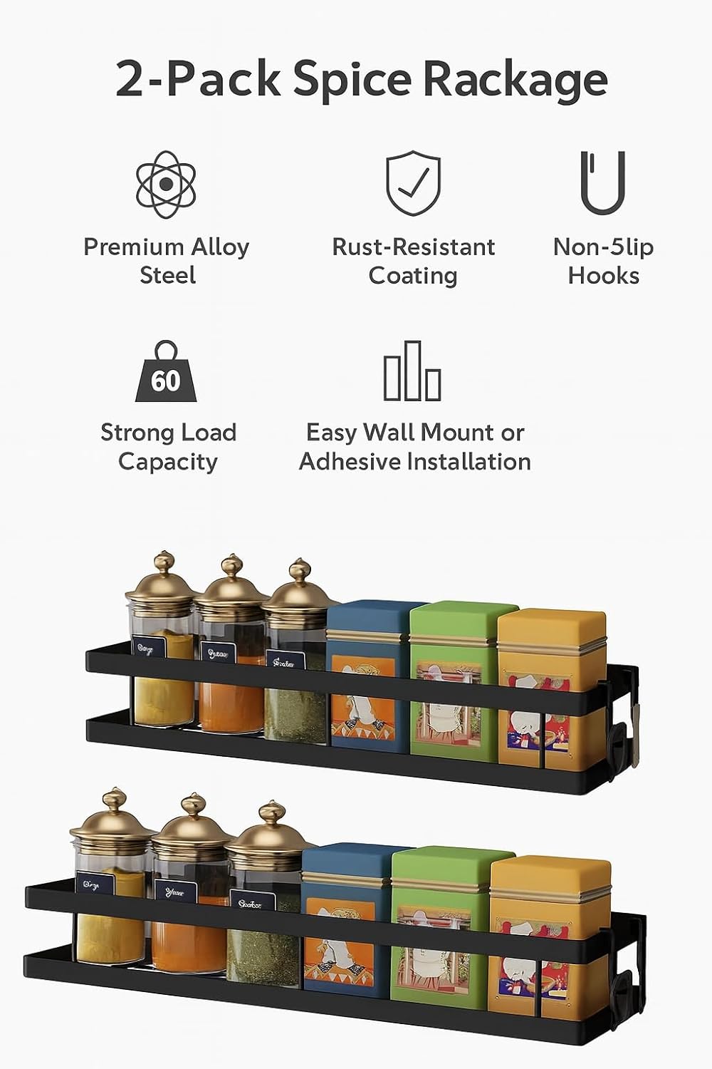 Space-Saving Wall-Mounted Design: These floating shelves free up valuable counter space and keep your spices, seasonings, condiments, and small bottles neatly arranged and easy to access.
