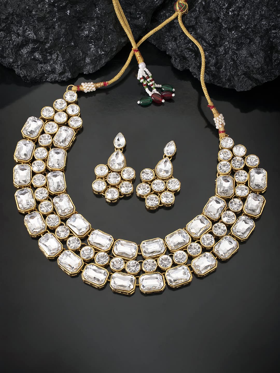 Peora Crystal Studded Gold Plated Layered Long Necklace & Dangle Earring Jewellery Set for Women & Girls