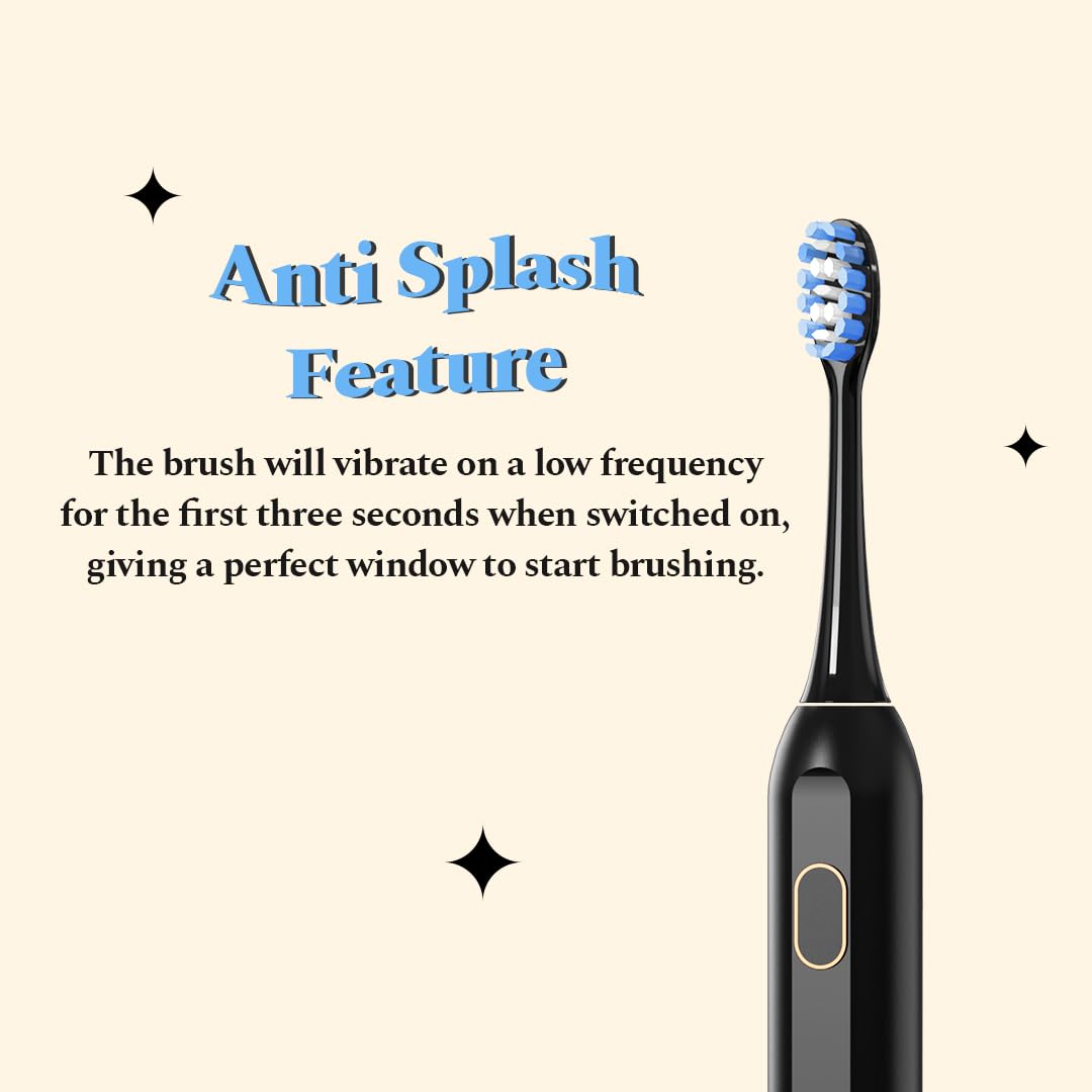 Smart Brushing Innovation: Benefit from a 2-minute smart timer that ensures optimal brushing duration. The anti-splash feature gently vibrates for the first 3 seconds to minimize mess, giving you a clean start every time.
