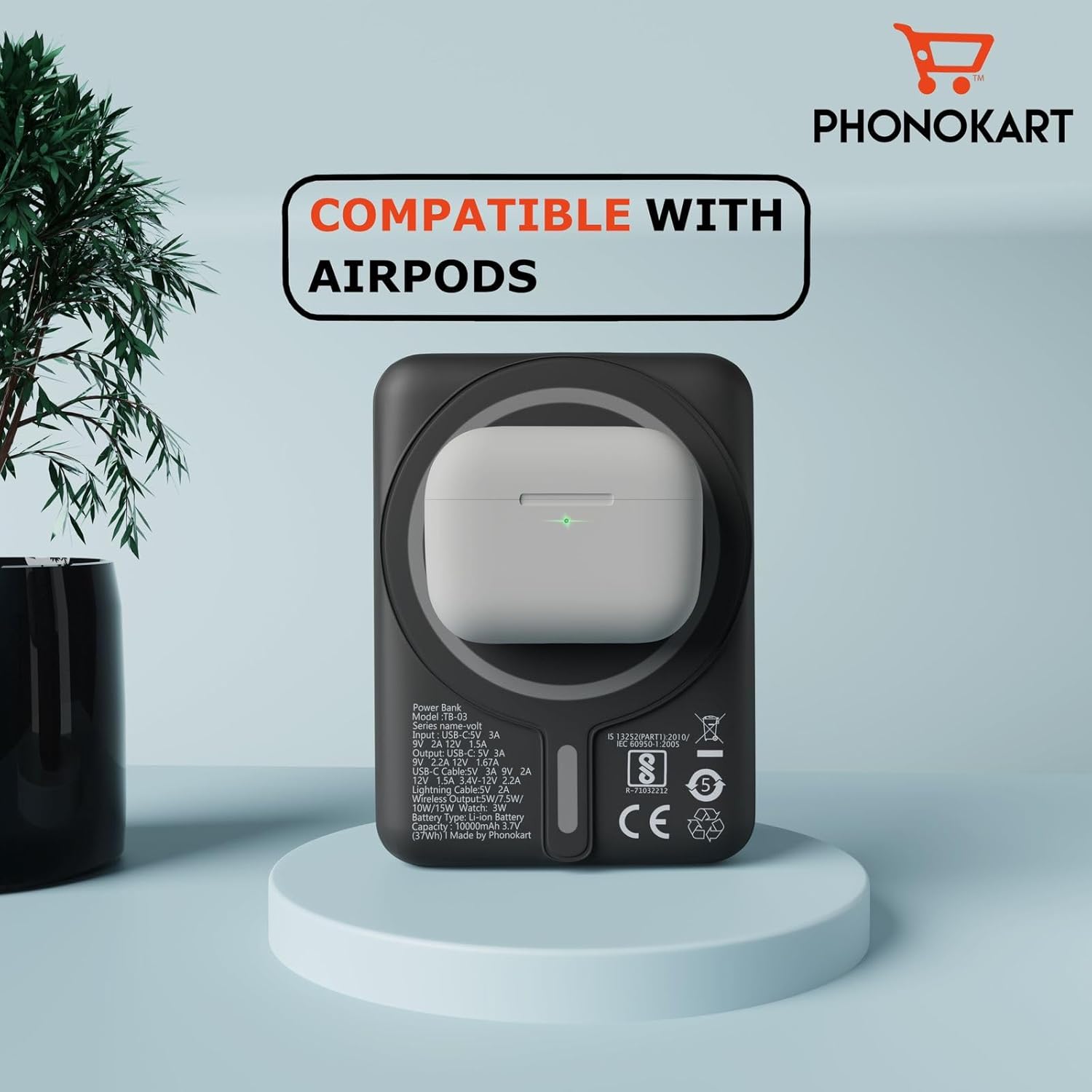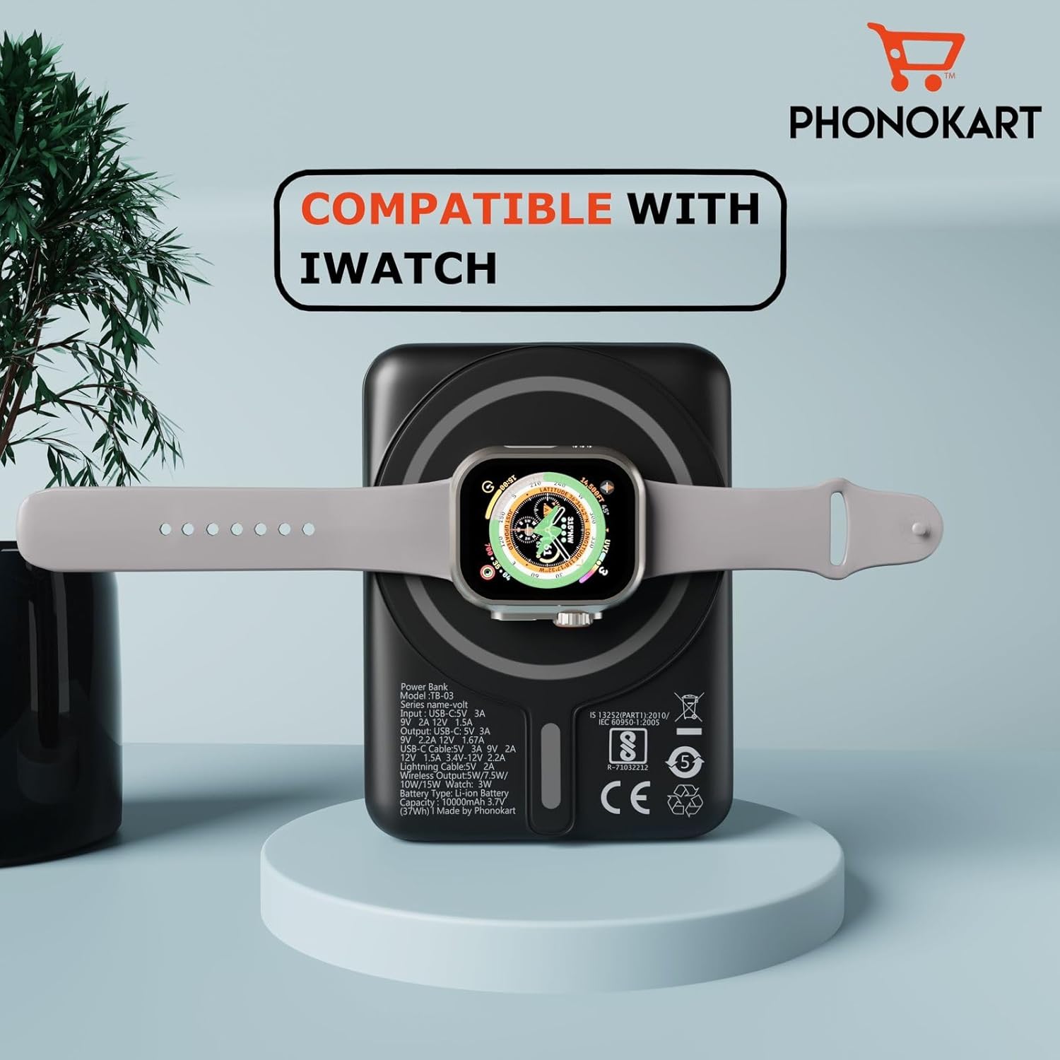Phonokart Volt 5 in1 10000mAh Compact Magnetic Power Bank with 15W Wireless for iPhone, 2.5W for AirPods & iWatch, Detachable inbuilt Lightning & Type-C Cables, 22.5W USB-A & Digital Display.