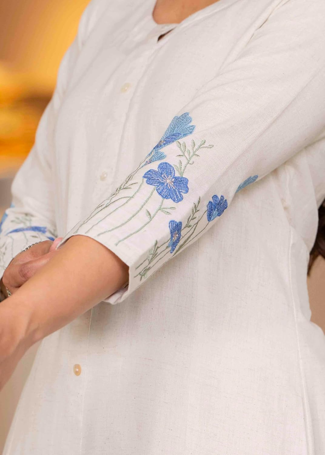 Pistaa’s Women Cotton Elegant Off-White Floral Embroidered Sleeves Kurta Palazzo Set