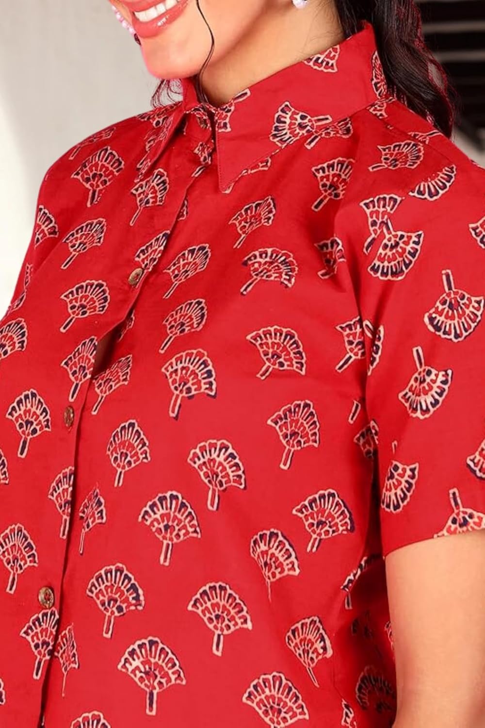 POPWINGS Ethnic Printed Cotton Half Sleeves Regular Fit Crop Shirts for Women Stylish Western Casual Wear