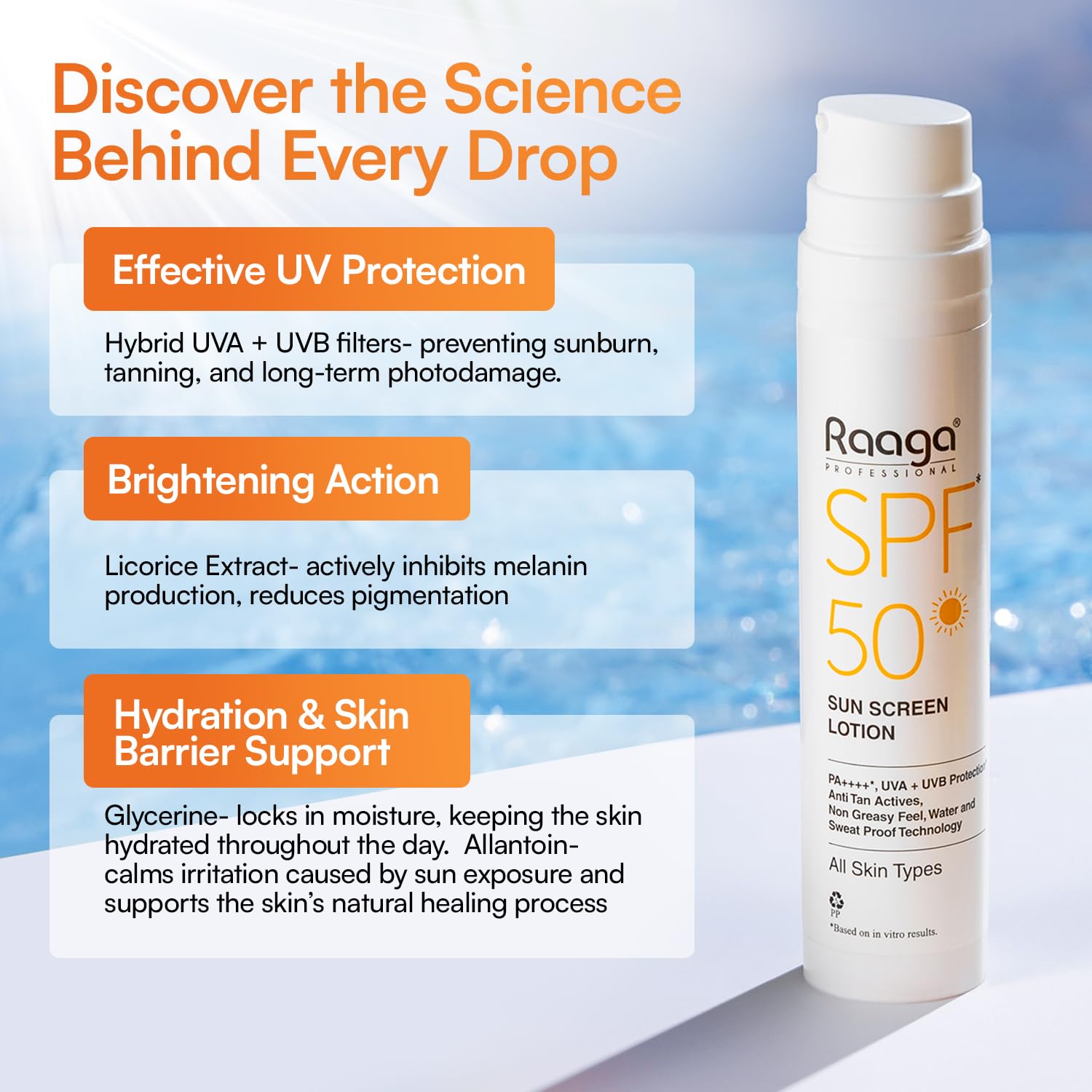 BrThe advanced formulation of Raaga Professional Sunscreen lotion offers broad-spectrum coverage, shielding your skin from the harmful effects of UVA and UVB rays.; Skin-This sunscreen lotion is designed to be gentle on your skin, leaving it moisturized and nourished. It is suitable for all skin types, including sensitive skin.