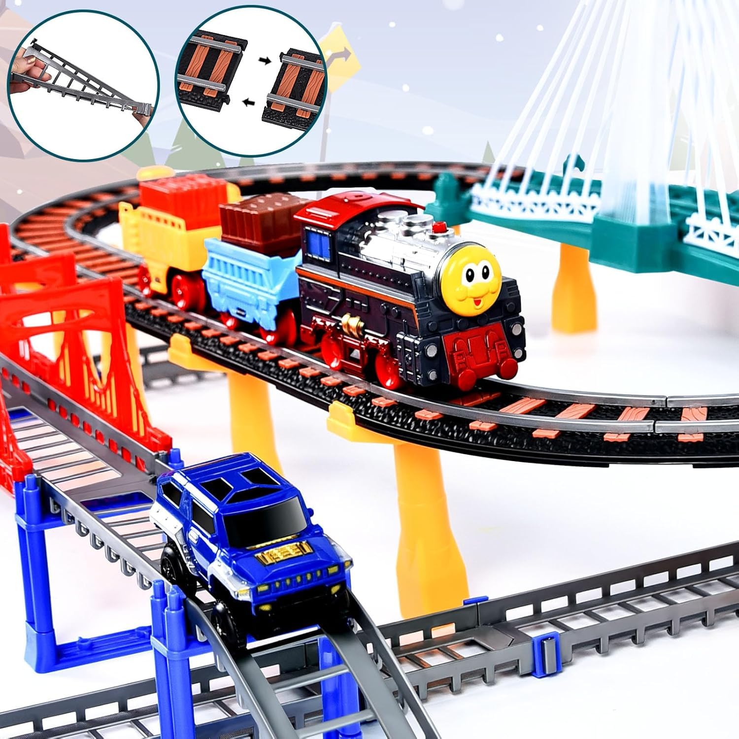 This racetrack toy set goes beyond trains; it is an all-in-one adventure. In addition to the extensive train routes, we have an exciting car track.