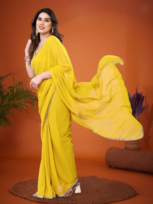 RAJESHWAR FASHION WITH RF Women’s Plain Georgette Sarees For Girls College Farewell & With Mirror Work Lace Border & Unstitched Blouse Material