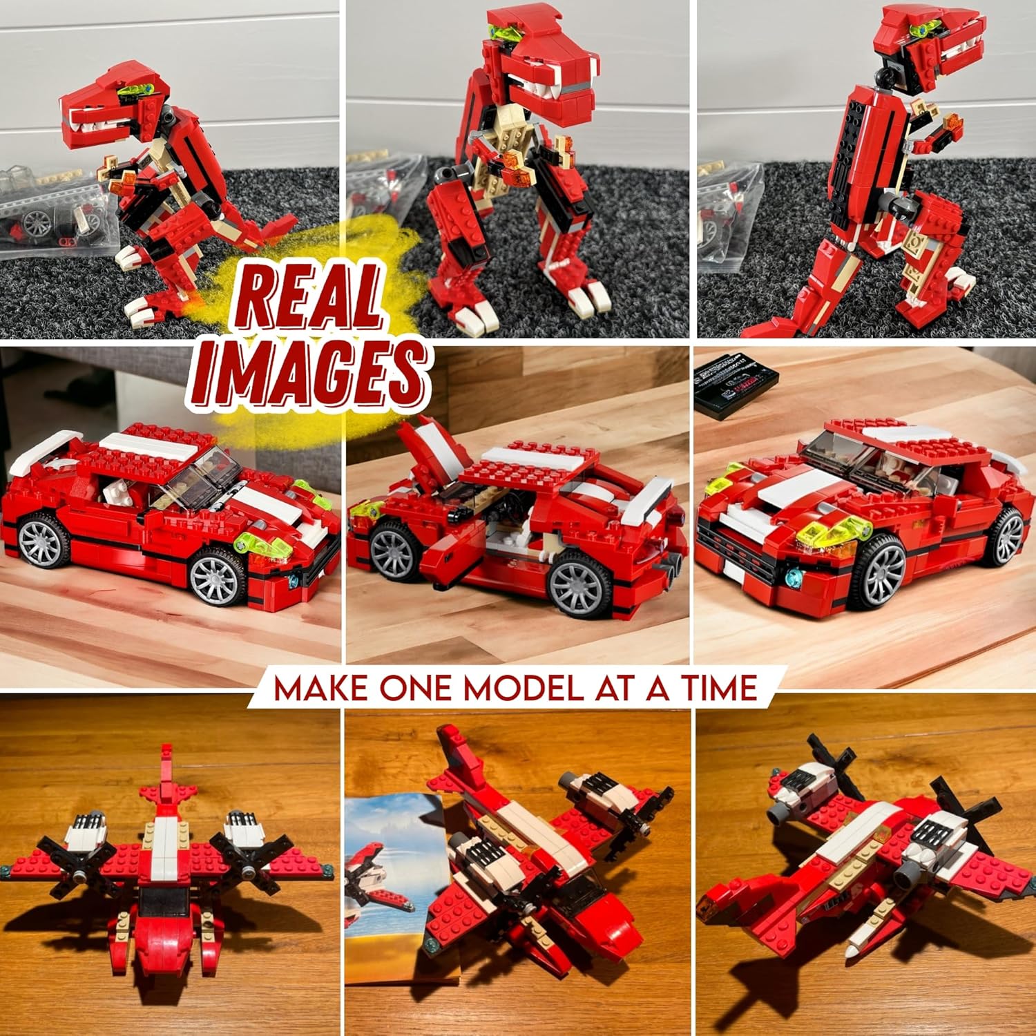 3-in-1 Model (Creator Dinosaur Set): Easily transforms into a stylish sports car, ferocious dinosaur, or dynamic twin-propeller seaplane for endless play.
