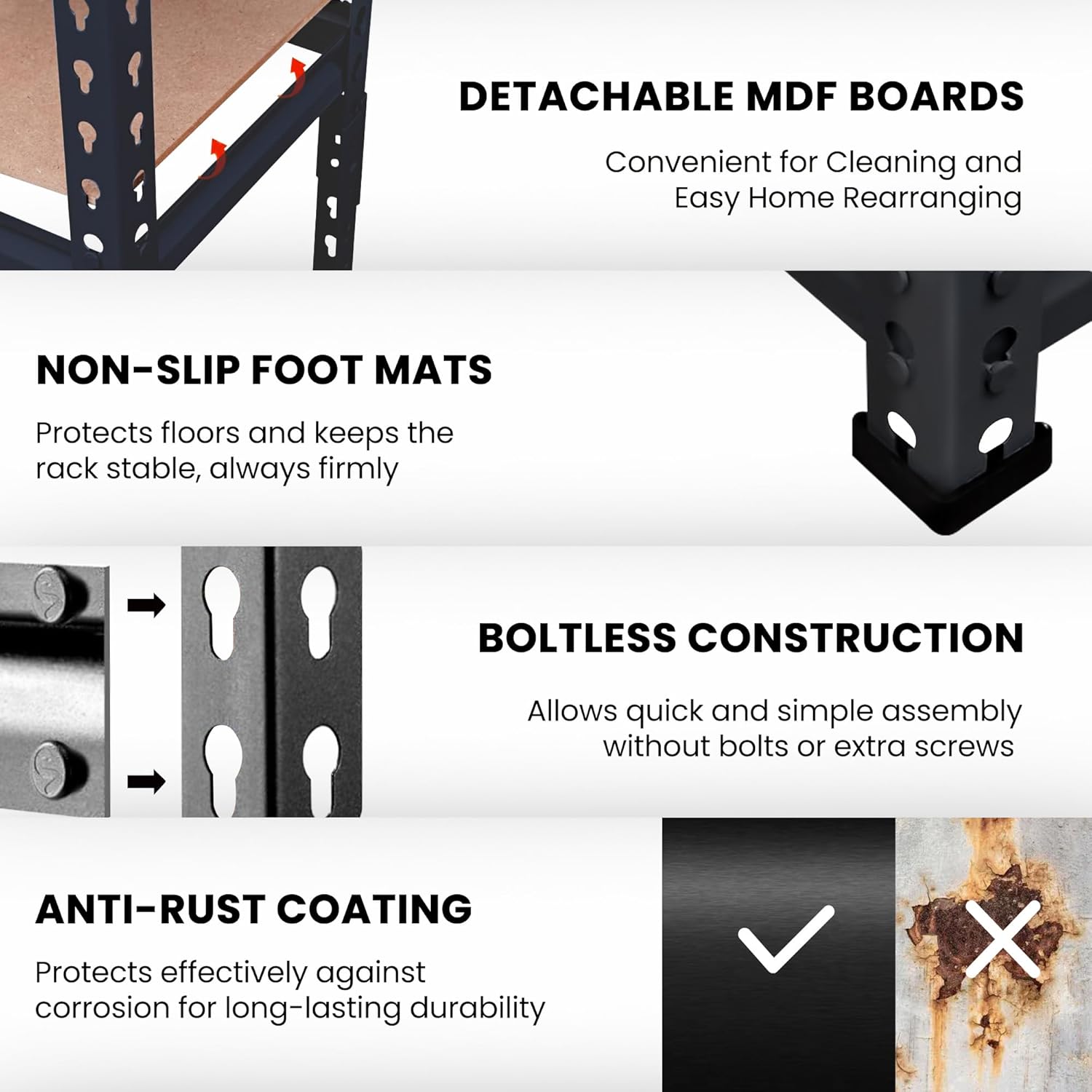 Durable Build: The strong iron frames and solid MDF boards can handle heavy weight and daily use easily. The powder-coated iron protects against rust. Non-slip feet keep the unit stable, and detachable planks make cleaning or repositioning easy.