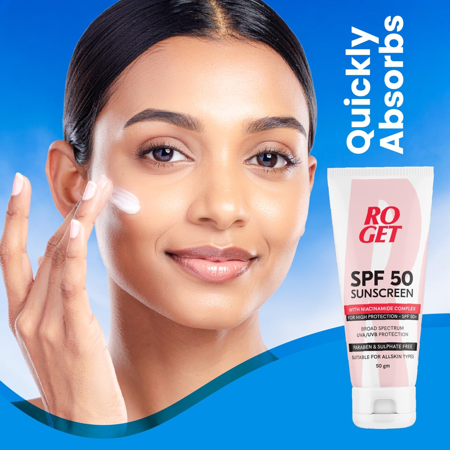 ROGET SPF 50 Sunscreen with Niacinamide Complex, Broad Spectrum UVA/UVB Protection, Paraben & Sulphate Free, All Skin Types, 50gm