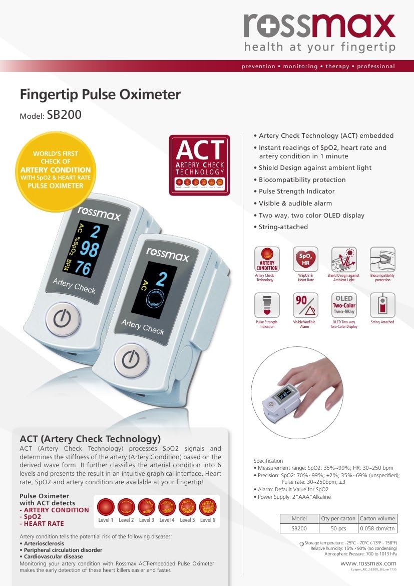 The Rossmax SB200 is a portable device used to measure blood oxygen saturation levels (SpO2) and pulse rate. It is commonly used in medical settings, as well as by individuals who want to monitor their SpO2 levels at home. The Rossmax SB200 Pulse Oximeter utilizes advanced technology to provide accurate and reliable readings. It typically features a compact design with a small display screen that shows the oxygen saturation percentage and pulse rate. The device is usually attached to the fingertip, and it uses infrared light to measure the oxygen saturation level by analyzing the light absorption of oxygenated and deoxygenated blood.