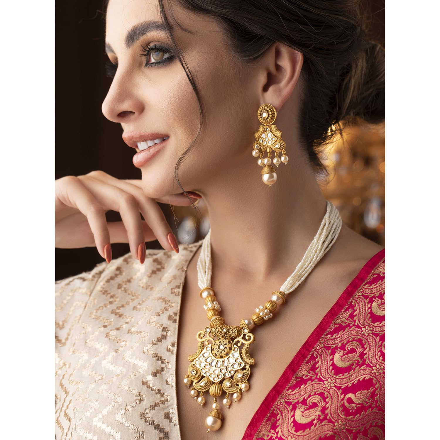 Rubans Gold-Plated Handcrafted Artificial Traditional Jewelry Set-Ruby/Kundan Stones & Pearl Beaded Multistrand with Matching Earrings For Women and Girls–Perfect for Weddings and Special Occasions