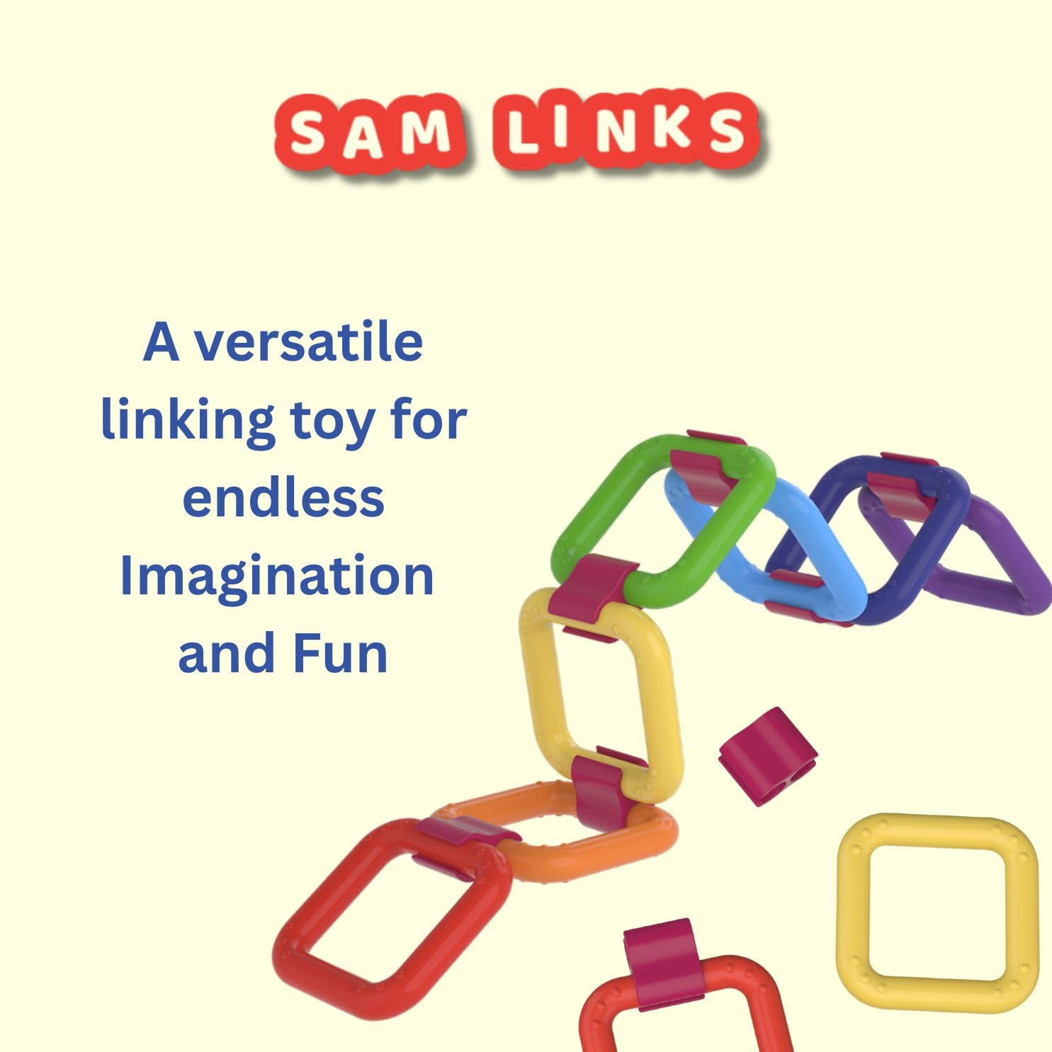 Samkins Sam Links is designed to offer open-ended construction play that allows kids to build, imagine, and discover in their own unique way. With simple snap-on connectors and bright, flexible pieces, children can create chains, patterns, and imaginative structures while naturally developing spatial awareness, problem-solving abilities, and creative thinking. There is no single right answer, every creation is a reflection of the child’s imagination. Sam Links works beautifully for solo play, sibling play, or group activities in classrooms and play areas. As children link and unlink pieces, they strengthen fine motor control and gain confidence in their ability to design and experiment independently.