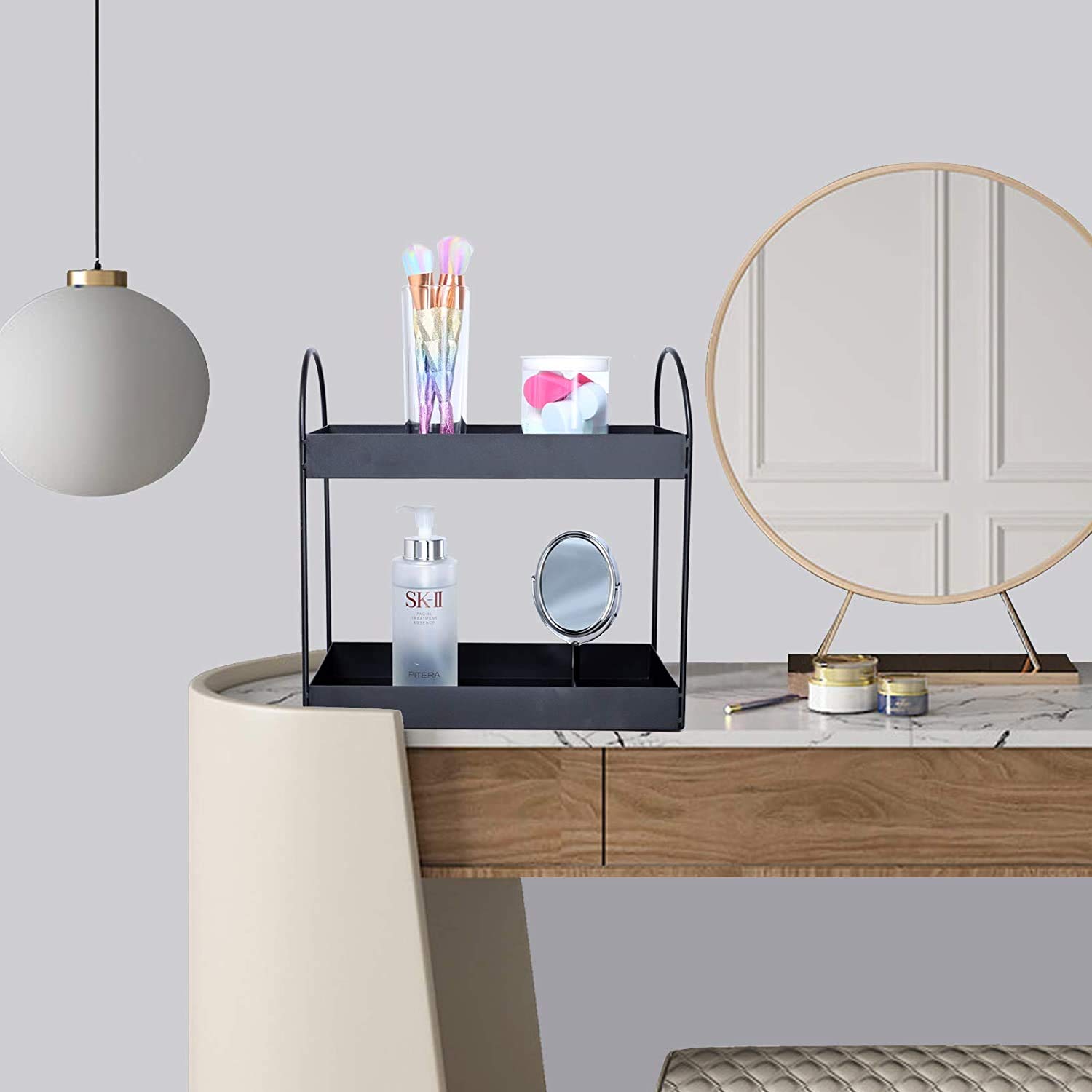 SHIOK DECOR Alloy Steel Coated 2 Tier Countertop Decorative Vanity Tray Cosmetic Makeup Storage/Kitchen Spice Organizer Standing Shelf Rack (Eco Grade Paint,Black)