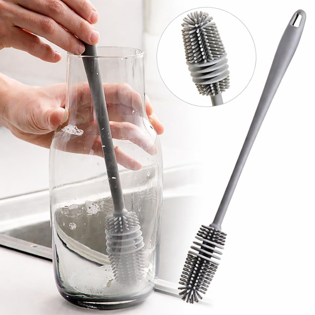 LONG HANDLE DESIGN: The extended long handle allows effortless cleaning of tall water bottles, narrow-necked glass containers, and deep flasks without wetting your hands.
