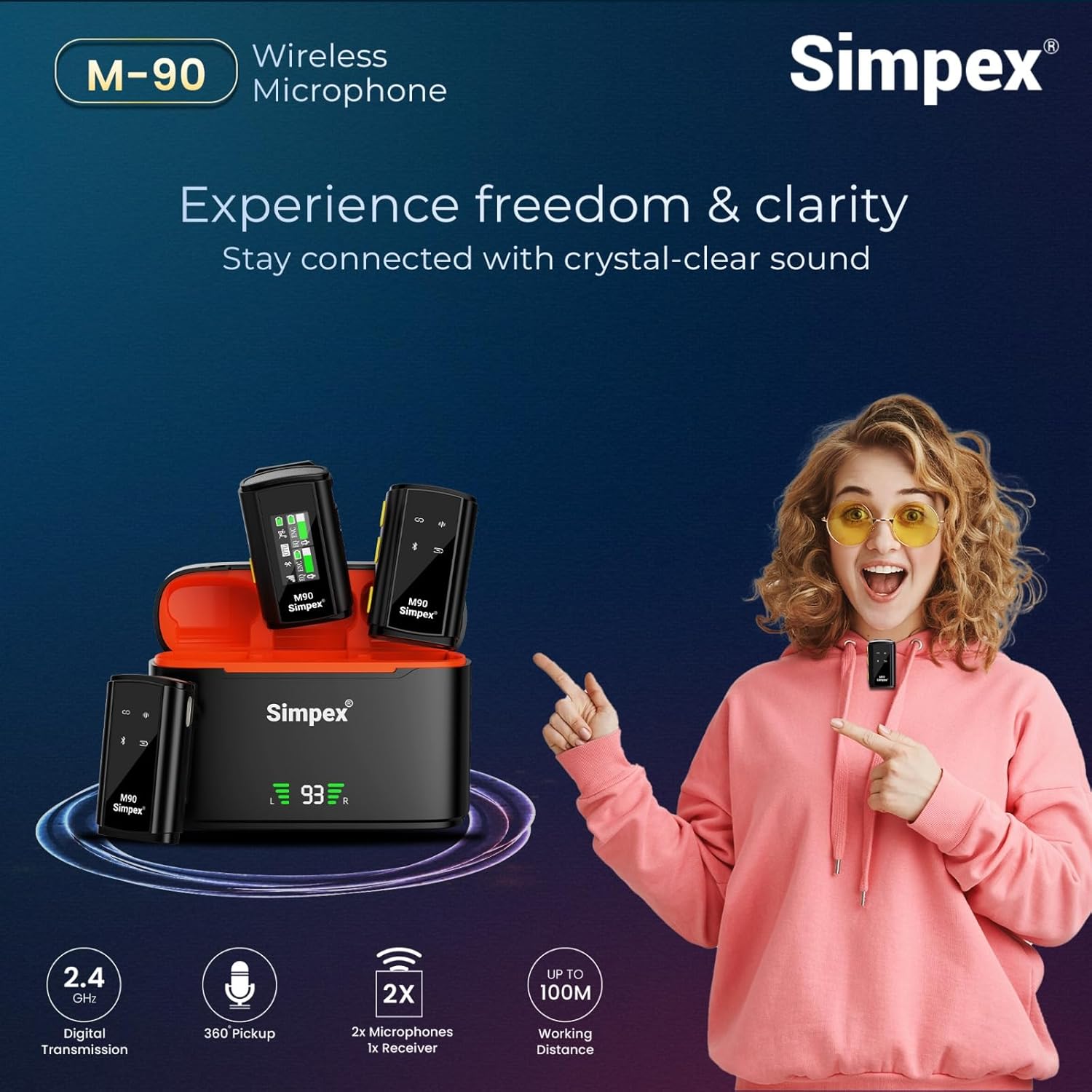 Simpex M-90 2-in-1 Wireless Microphone Mic with TFT Card Recording & 360° Sound Capture, 100m Range, 2.4 GHz RF 9Hrs Run Time Noise Cancellation Plug & Play Compatible with Android, iOS, DSLR