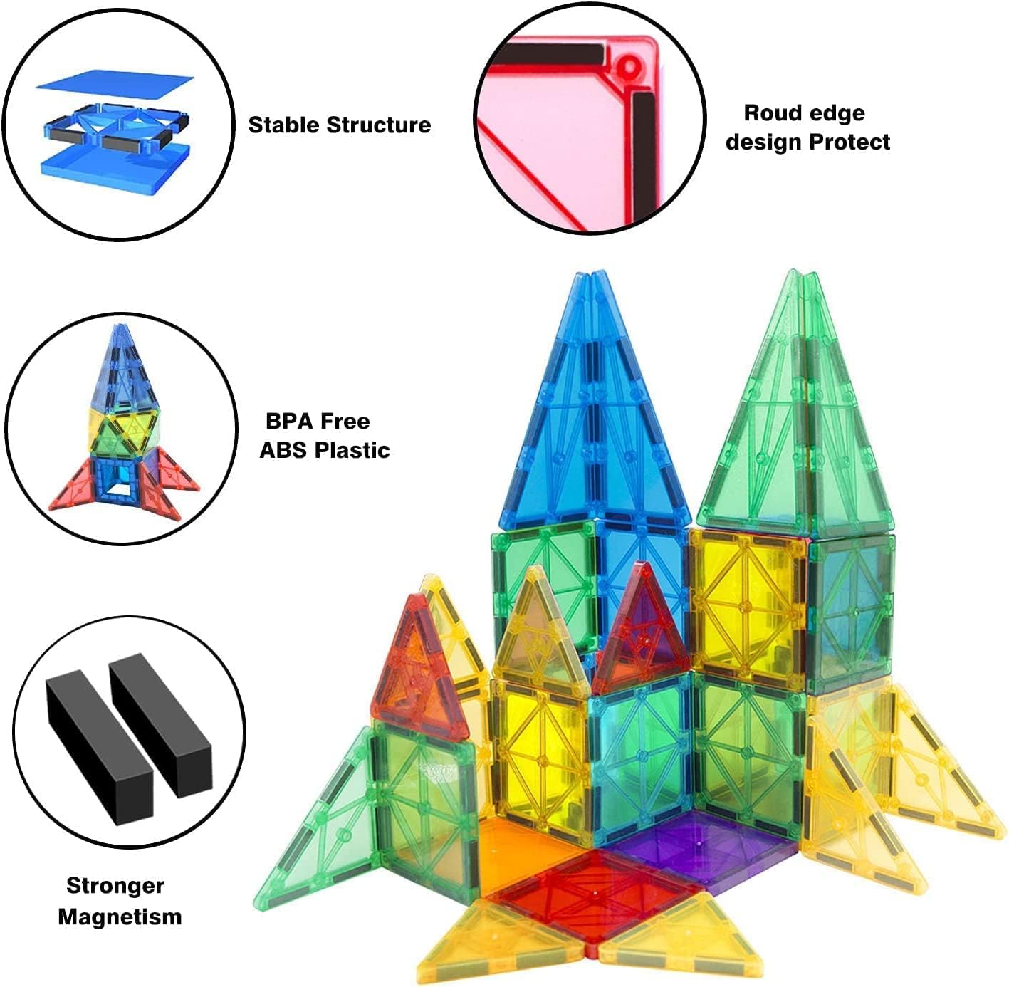Strengthens Fine Motor Skills: Manipulating the magnetic tiles and assembling them into various structures helps improve children’s fine motor skills and hand-eye coordination. The precise movements required to connect the tiles contribute to their dexterity.
