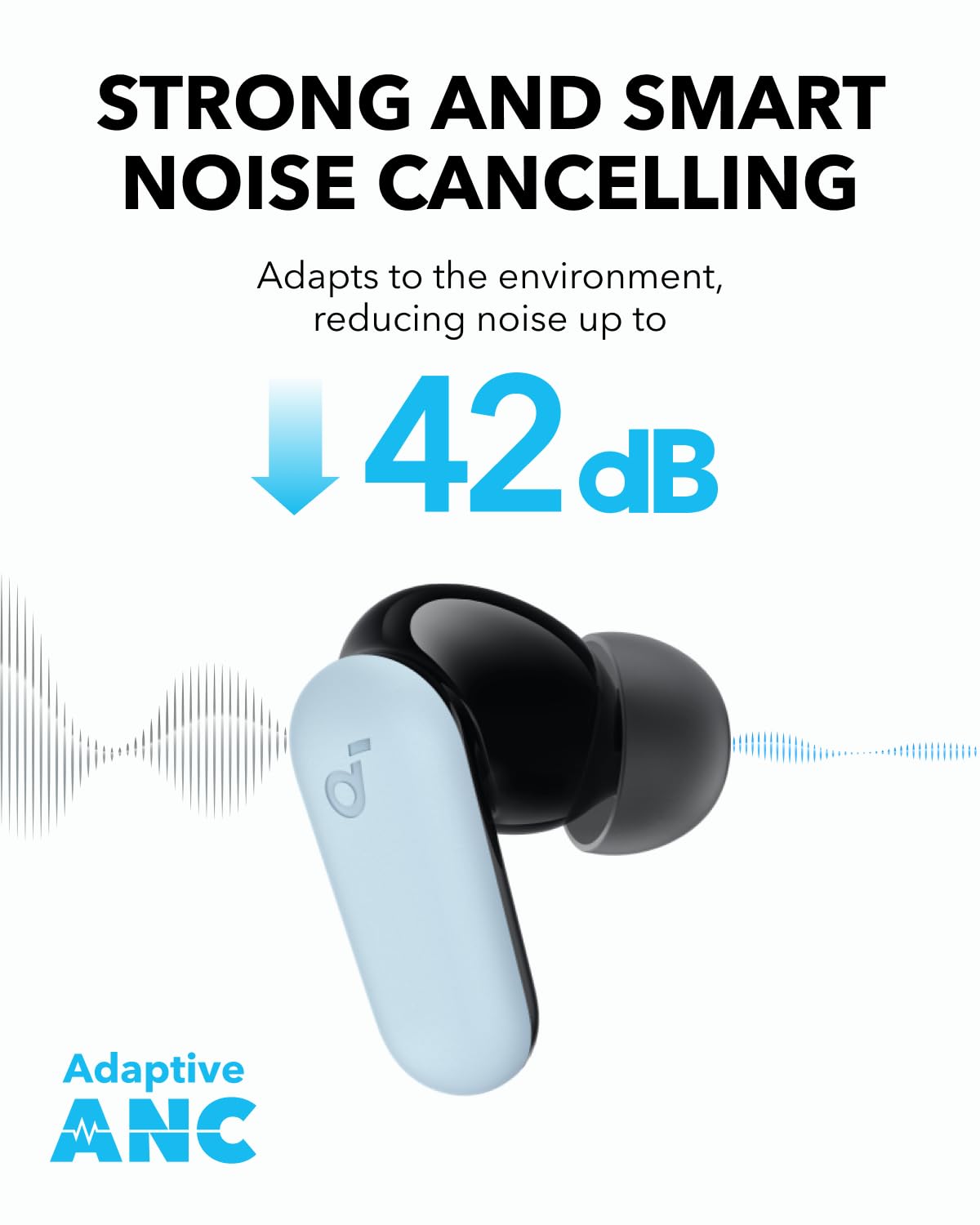 2. Strong and Smart Noise Cancelling: Reduce noise by up to 42dB with an advanced active noise cancelling system. With adaptive technology, soundocre R50i NC detects external sound and automatically selects a level of noise cancelling optimized for your ears.