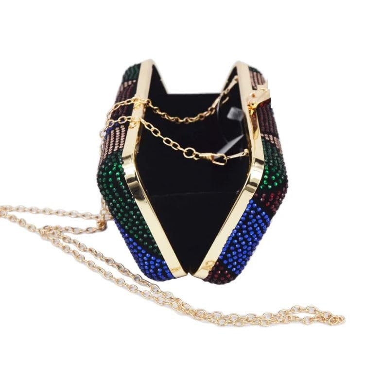 Elevate your evening ensemble with this sparkling multicoloured rhinestone clutch handbag. Crafted with meticulous attention to detail, this dazzling purse features a captivating geometric pattern adorned with shimmering crystals in vibrant hues of blue, green, red, and gold. The eye-catching design is sure to make a statement, whether you’re attending a glamorous soiree or a festive celebration. Complemented by a sleek golden chain strap, this clutch effortlessly transitions from a chic handheld accessory to an elegant shoulder bag. Exuding sophistication and elegance, this rhinestone clutch is the perfect companion to complete your stylish look. Embrace the allure of this exquisite piece and let it be the radiant centerpiece of your evening attire.
