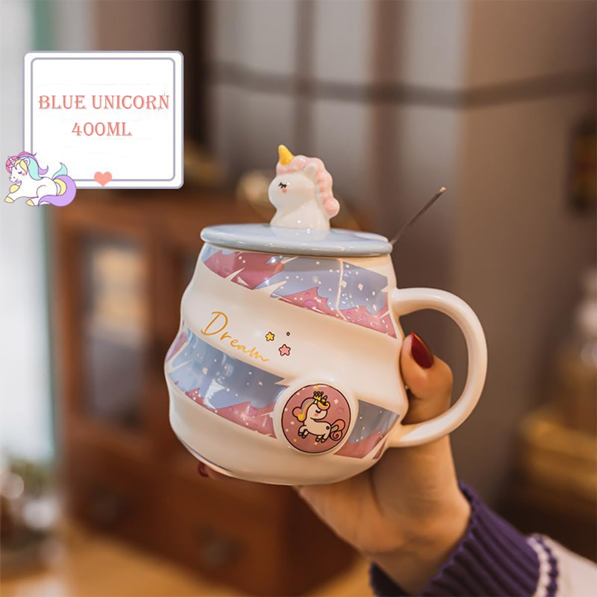 Spooky Unicorn Ceramic Mug with Lid and Spoon – 400ml Cartoon Coffee Cup for Kids, Girls & Women – Gift for Birthday, Office, Christmas, Valentine’s Day – Ins-Style Animal Tea Mug (Blue)