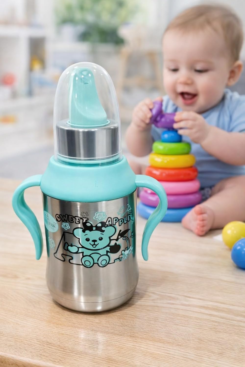this Premium Stainless Steel Baby Feeding Bottle with Dual Handles. Whether your little one is just beginning their feeding journey or transitioning to independent drinking, this bottle is thoughtfully designed to support every stage. The 2-in-1 convertible system includes a soft silicone feeding nipple for infants and a sipper spout for older babies and toddlers. This ensures that as your baby grows, the bottle grows with them — eliminating the need for multiple products. The soft nipple mimics natural breastfeeding, while the sipper promotes healthy oral development and easy sipping. Made from high-quality stainless steel, the bottle maintains the temperature of milk or water longer than ordinary plastic bottles. It is hygienic, resistant to rust, a
